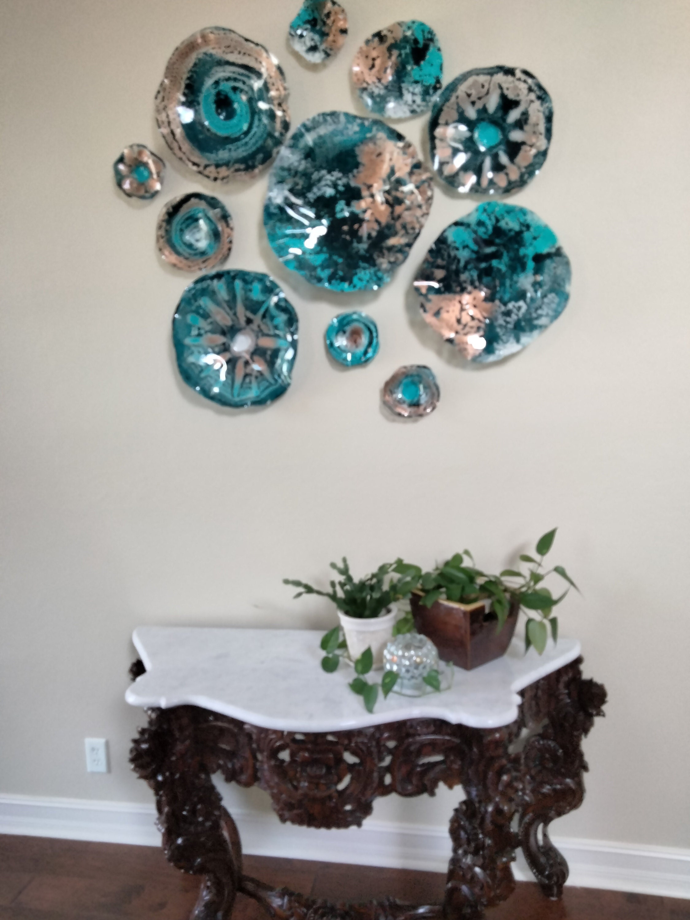 From the wall, they look like glass. The bonuses are that these flowers are light, unbreakable, environmentally friendly, easy to hang, and have no damage to the wall due to drilling for would-be-heavy traditional glass flowers.