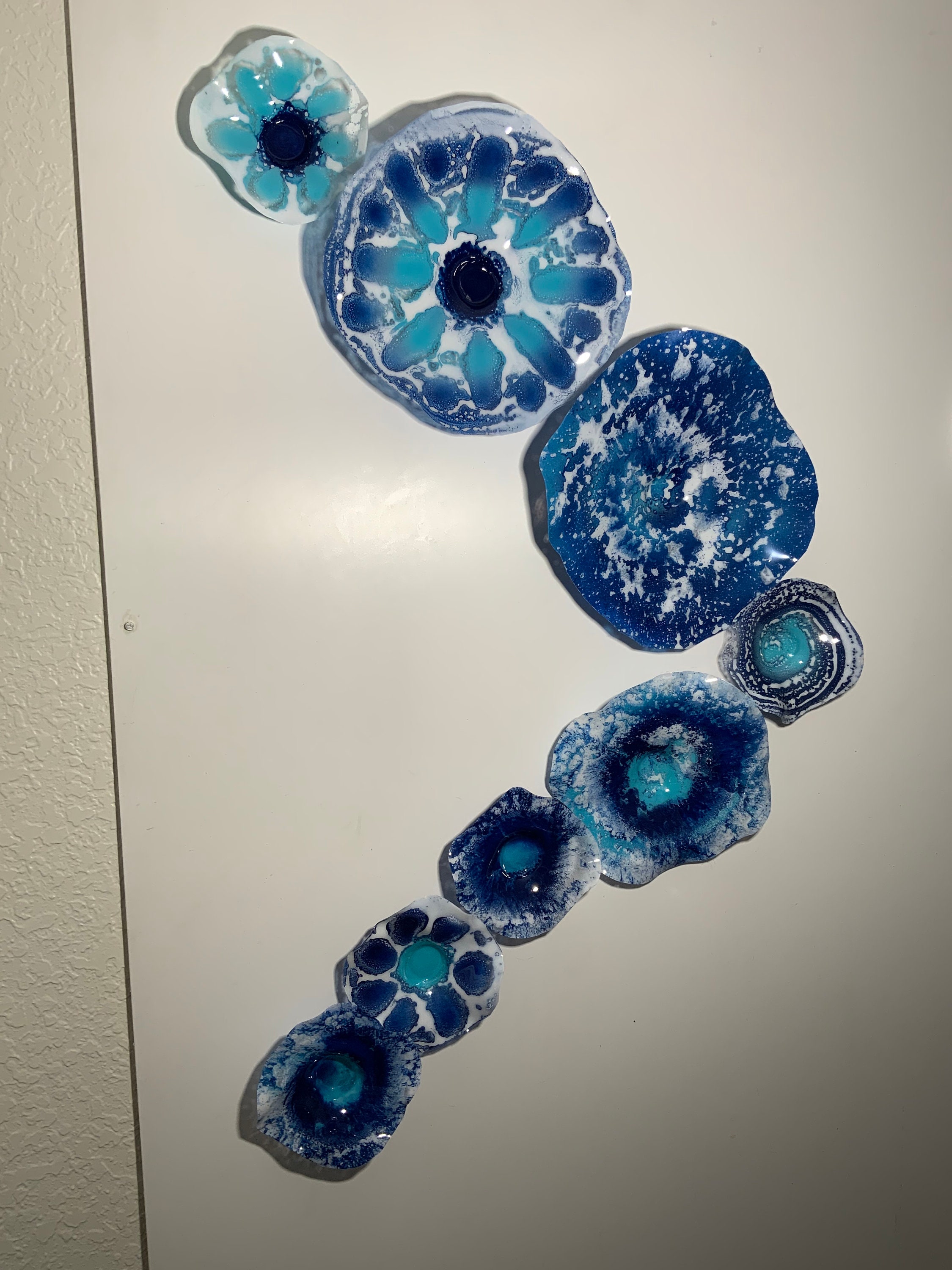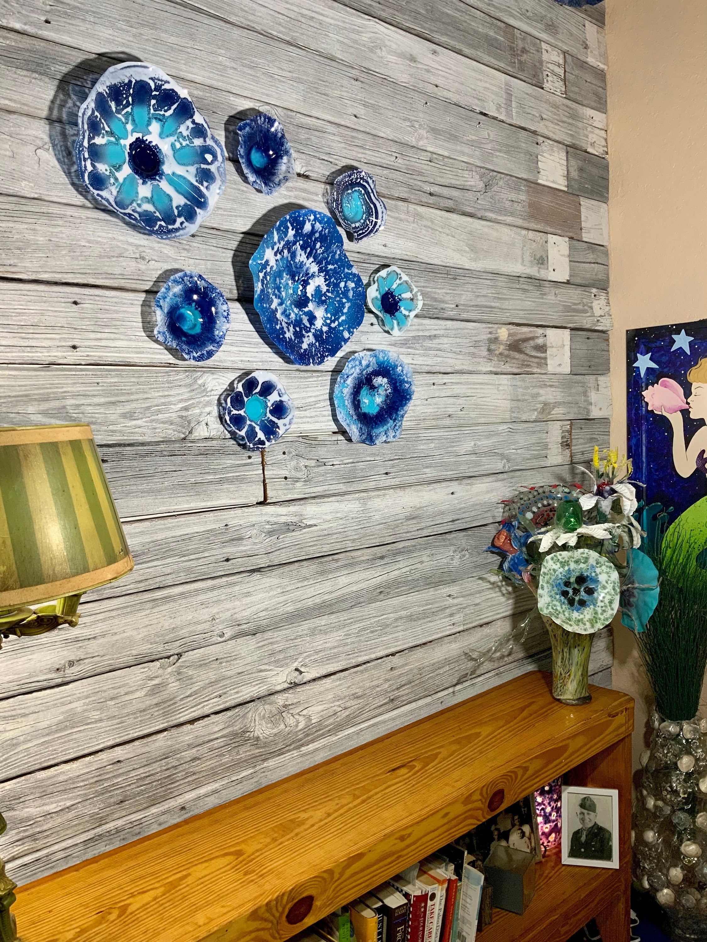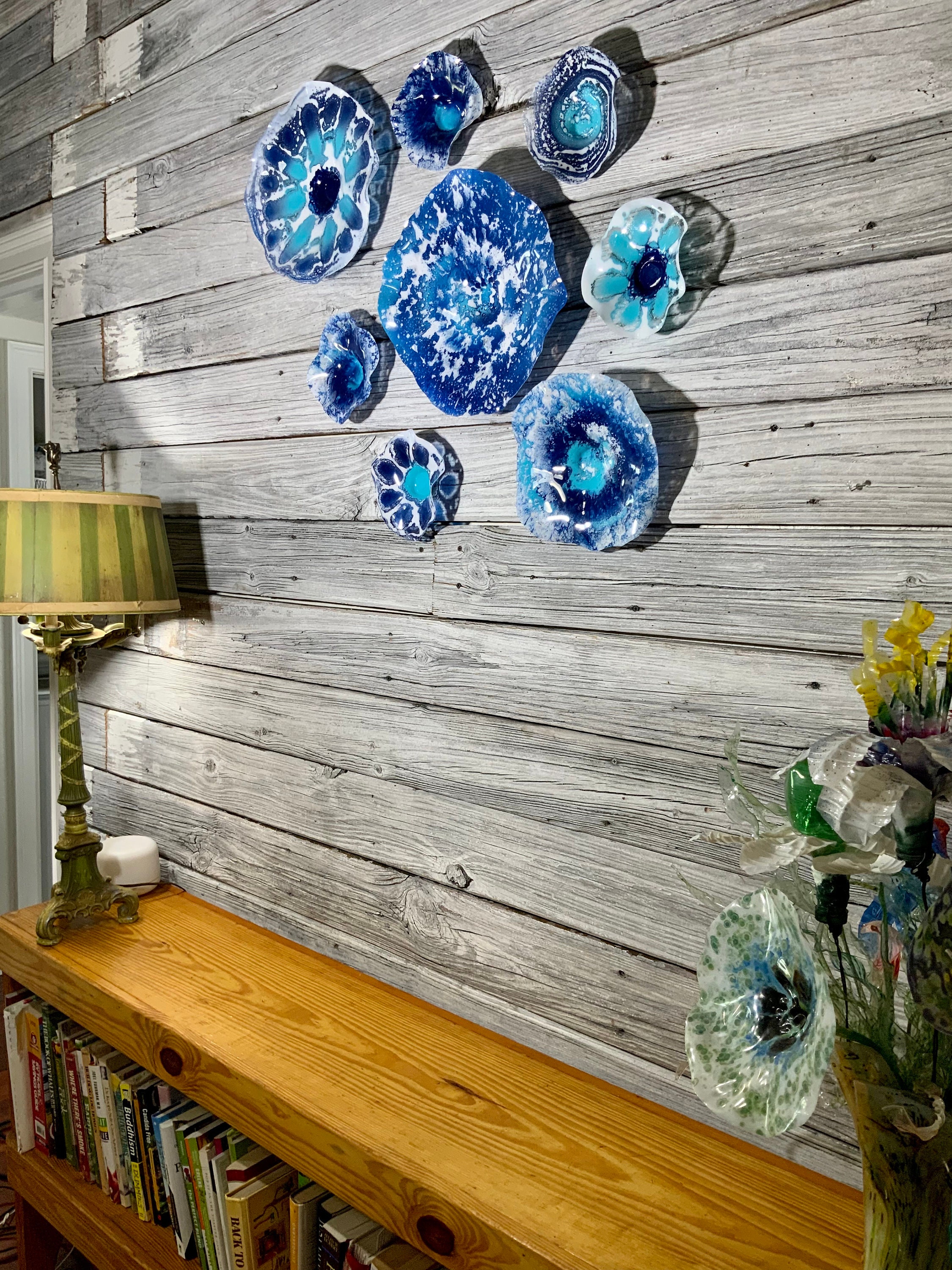 From the wall, they look like glass. The bonuses are that these flowers are light, unbreakable, environmentally friendly, easy to hang, and have no damage to the wall due to drilling for would-be-heavy traditional glass flowers.