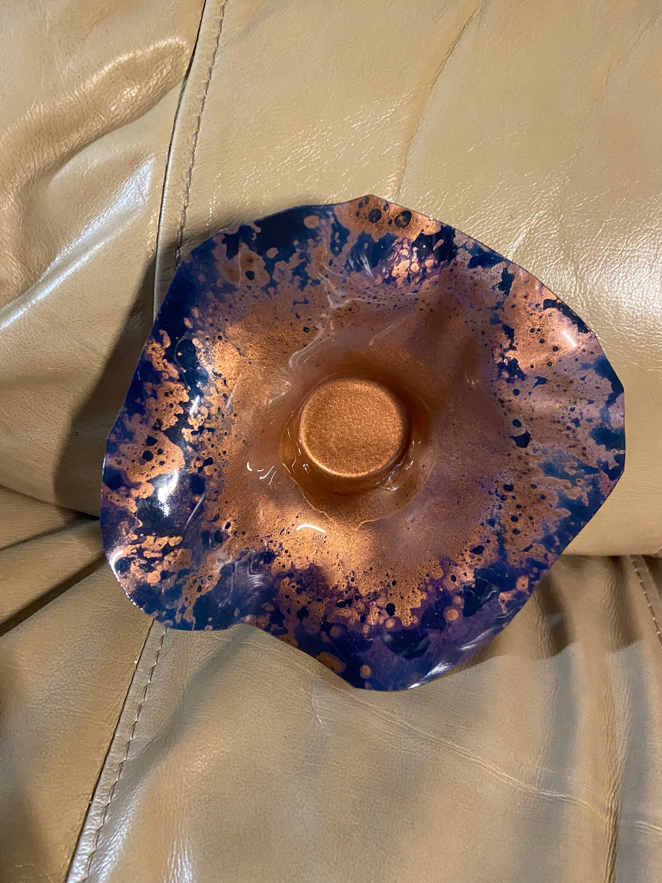 A smaller Wall Flower—but just as Unique and Stunning. Another one-of-a-kind piece—this one has a stunning copper center with a dark (denim—ink) color surrounding the center. Interesting patterns are always a signature part of the plates’ design. Very Happy with my purchases! :) —Will be a Repeat Customer!! Janice L.