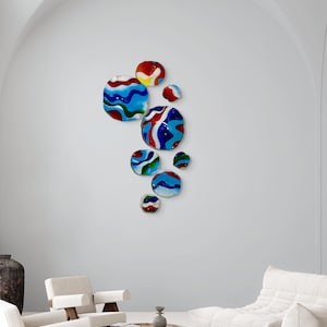 Calm and colorful shades of ocean blues inspired by the colors of the sea wall flowers set of 12. This piece will add color and joy to any space. The light filters through casting a colorful effect on the hanging surface. The flowers pictured are the ones you will receive.