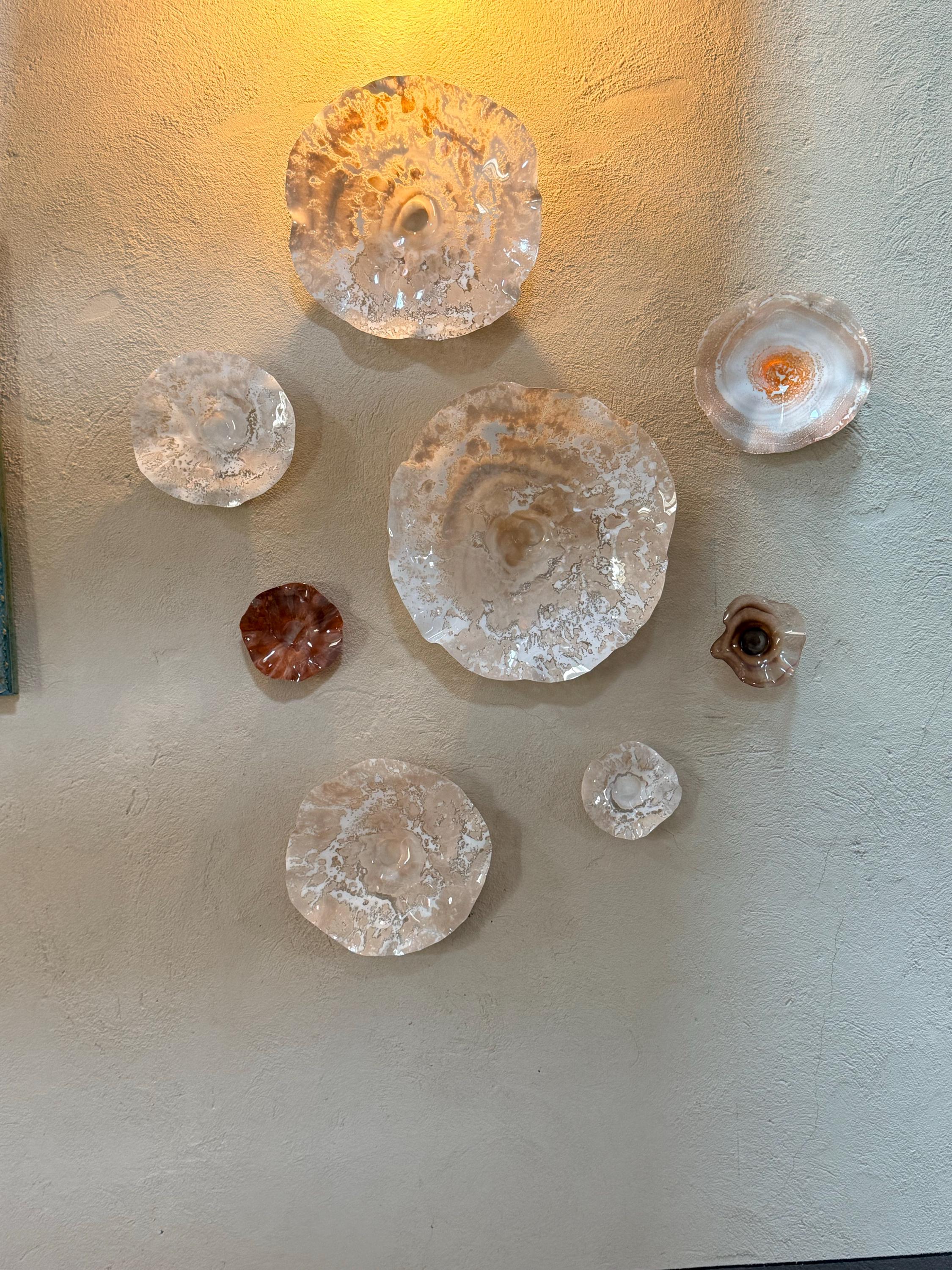 Each collectible piece is unique, no two are alike. This permanent, colorful, eye catching art looks and feels like glass. They shimmer in the light resembling water. They are very DURABLE AND LIGHTWEIGHT Great for indoor or outdoor decorating.