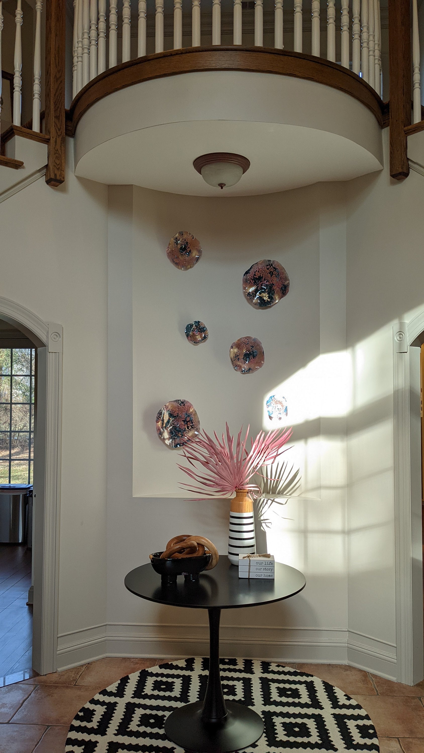 Wall Flower platter 6 teal blue/gold/pink up-cycled plastic/patio decor/looks like glass large wall mount mural home decor/ceiling hanging