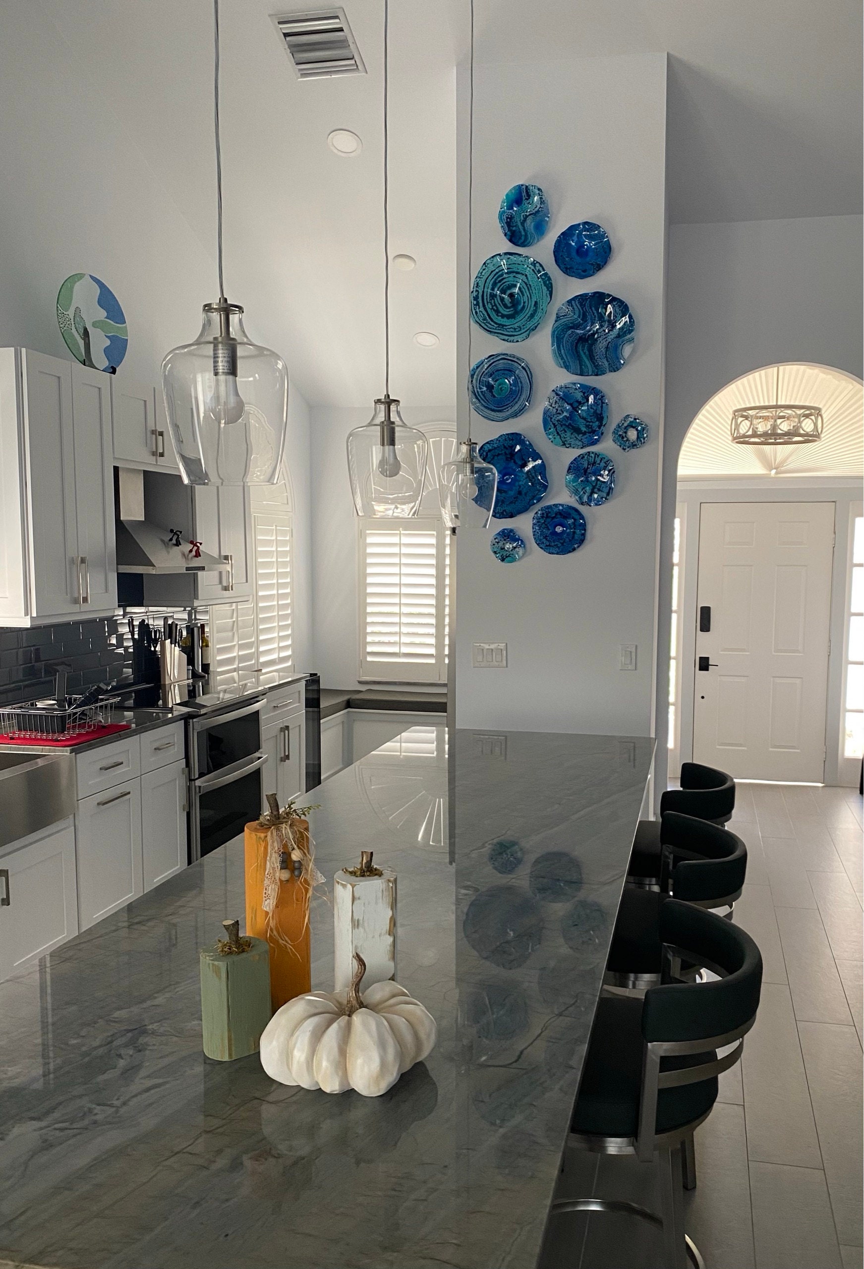 From the wall, they look like glass. The bonuses are that these flowers are light, unbreakable, environmentally friendly, easy to hang, and have no damage to the wall due to drilling for would-be-heavy traditional glass flowers.