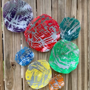 Each collectible piece is unique, no two are alike. This permanent, colorful, eye catching art looks and feels like glass. They shimmer in the light resembling water. They are very DURABLE AND LIGHTWEIGHT. These flowers are easy to hang, are all weather and UV resistant. Great for indoor or outdoor decorating.