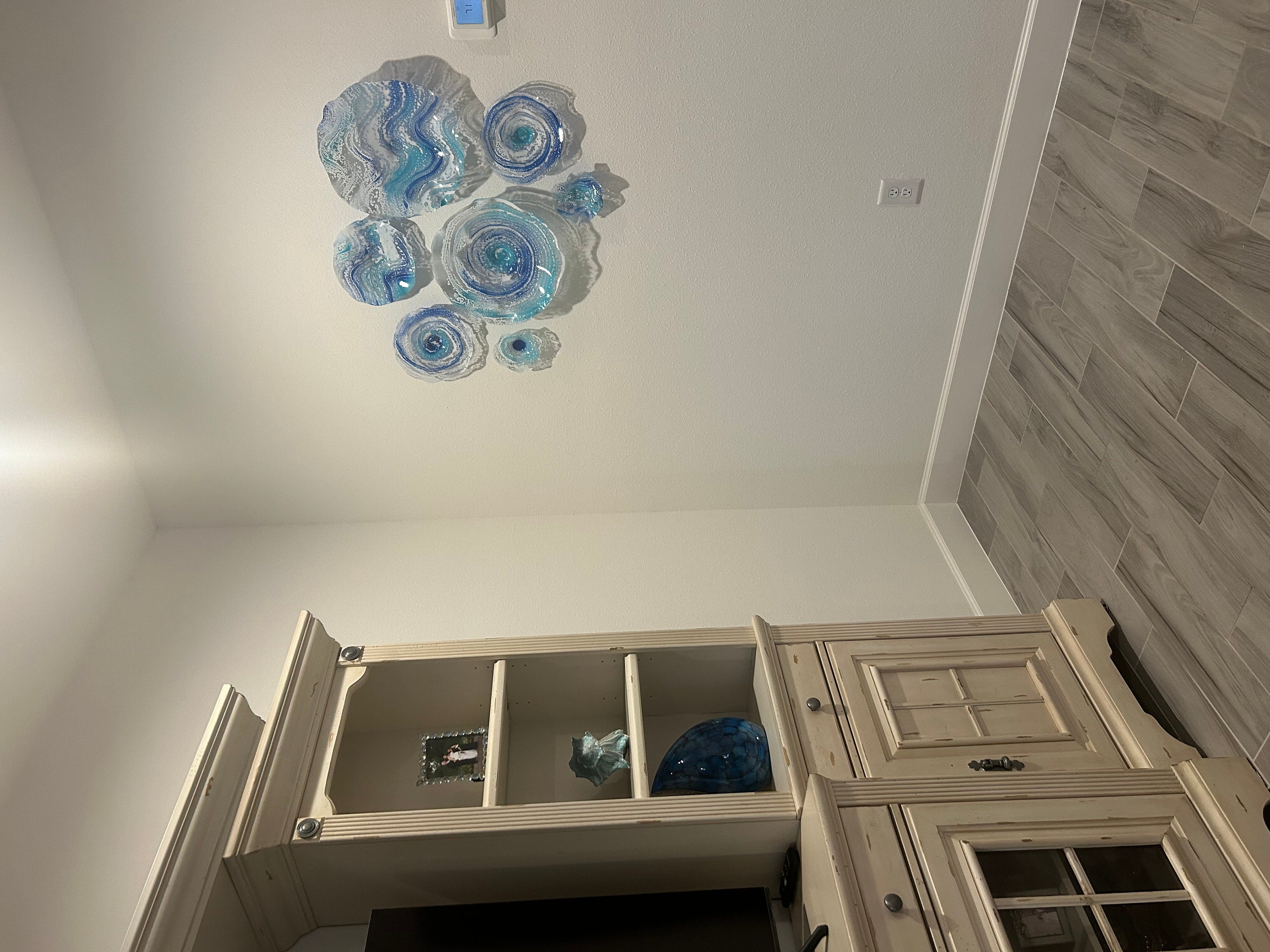 From the wall, they look like glass. The bonuses are that these flowers are light, unbreakable, environmentally friendly, easy to hang, and have no damage to the wall due to drilling for would-be-heavy traditional glass flowers.