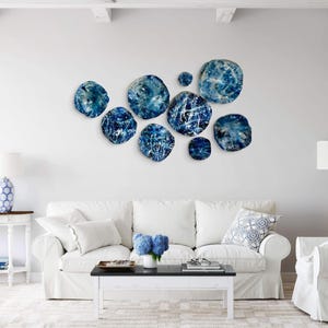 Wall flower sculpture 7 silver/sea foam blue-green/blue up cycled plastic indoor/outdoor decor/looks like glass/boho home wall mural plates