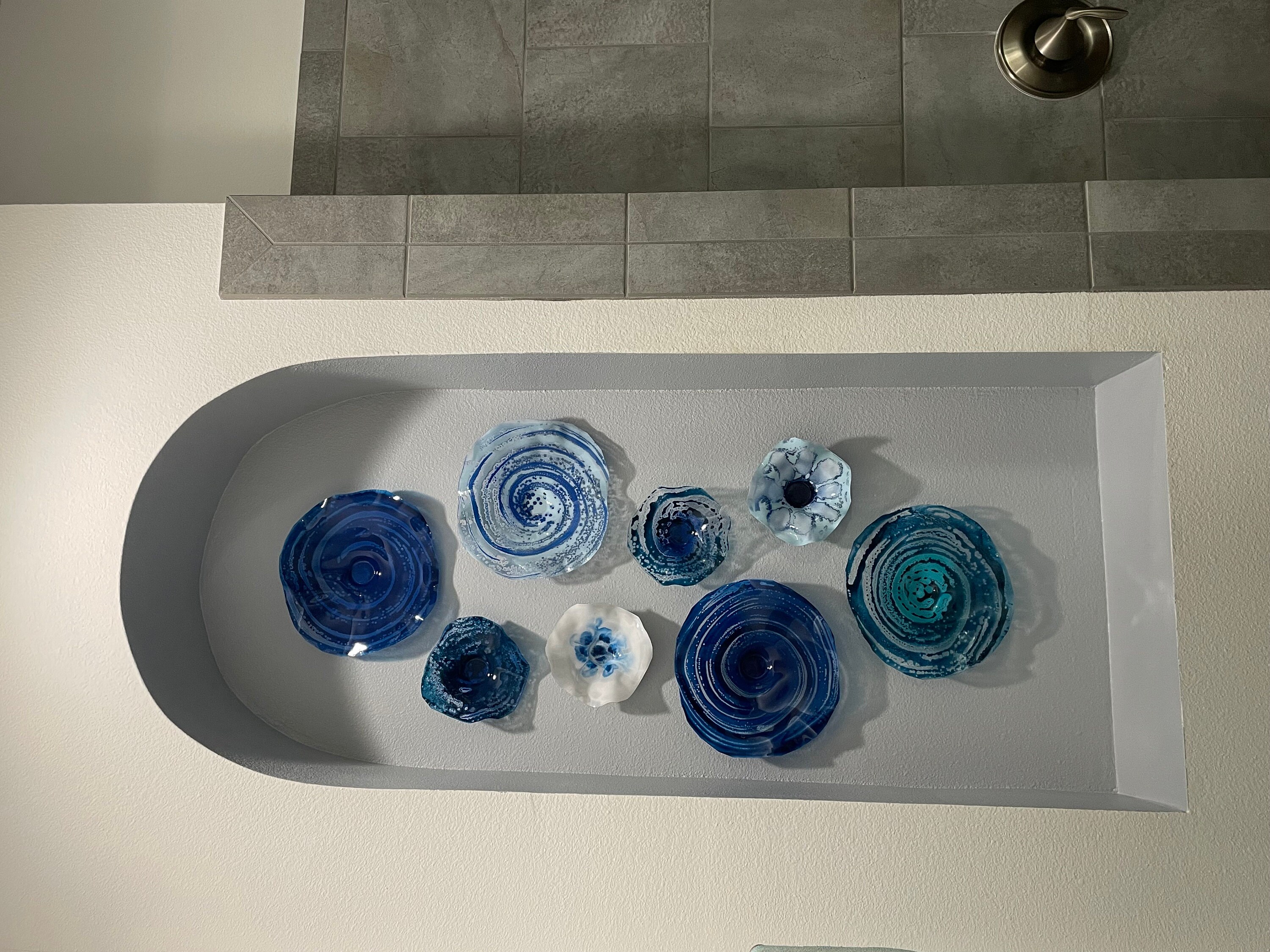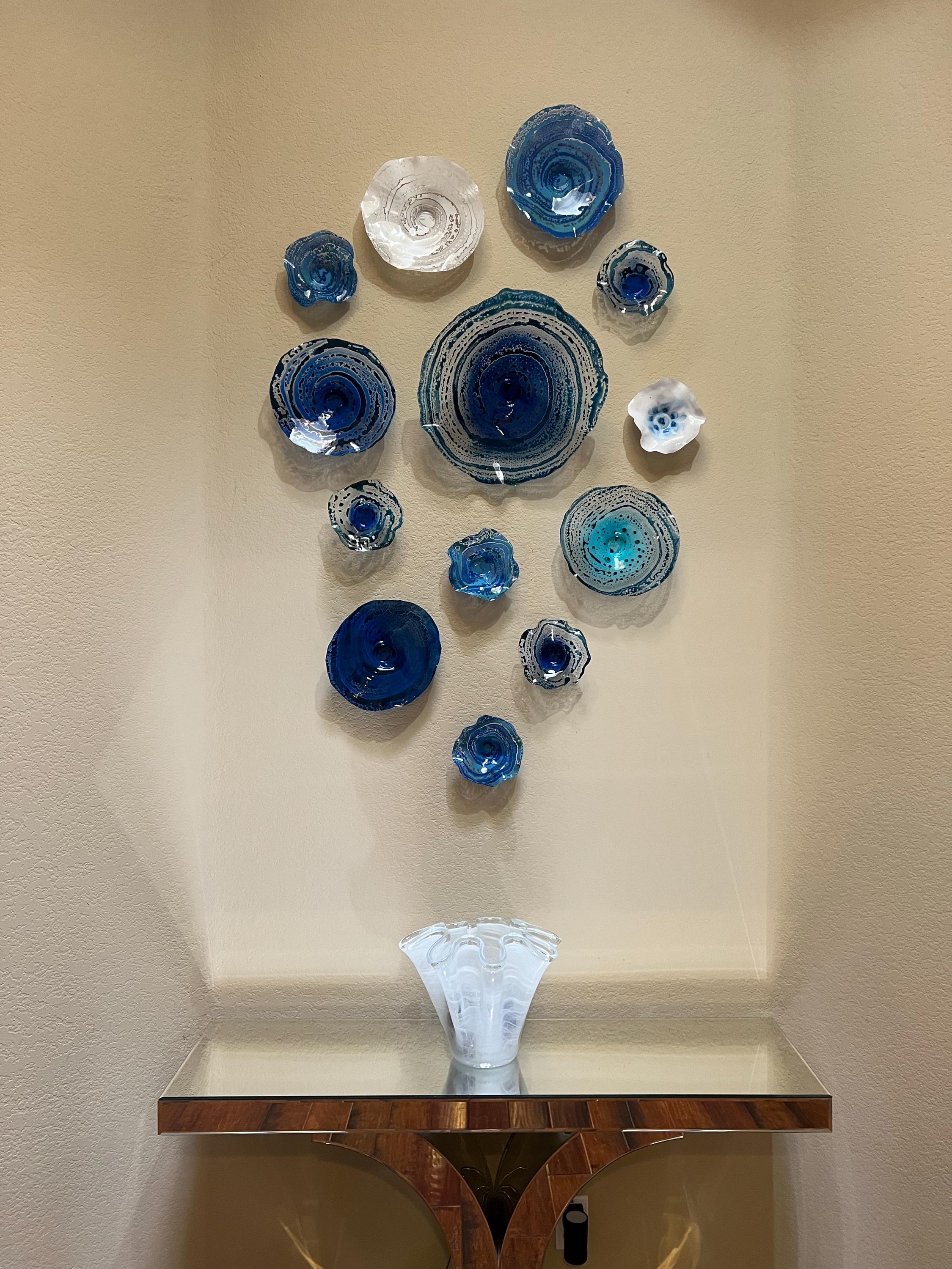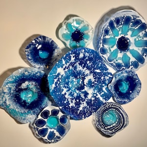 From the wall, they look like glass. The bonuses are that these flowers are light, unbreakable, environmentally friendly, easy to hang, and have no damage to the wall due to drilling for would-be-heavy traditional glass flowers.