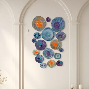 Each flower come with a hanger with a hole in the back for easy hanging. Each piece is light weight and all you will need is a nail or thumb tack to hang it from. If you can hang a picture, you can hang these plates. Each order comes with a set of hanging instructions. For outdoor hanging, please request our free outdoor hardware. For ceiling hanging please request velcro.