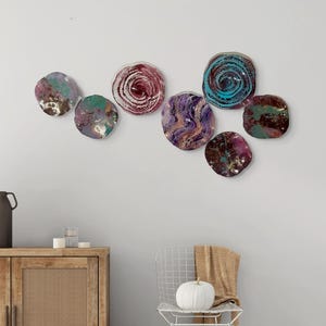 Each collectible piece is unique, no two are alike. This permanent, colorful, eye catching art looks like glass. They shimmer in the light resembling water. They are very DURABLE AND LIGHTWEIGHT. These flowers are easy to hang, are all weather and UV resistant. Great for indoor or outdoor decorating.