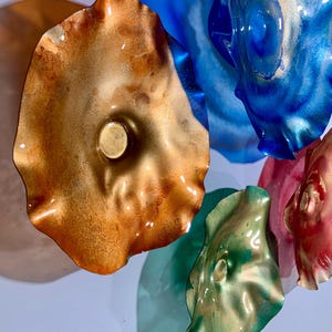 Each flower come with a hanger with a hole in the back for easy hanging. Each piece is light weight and all you will need is a nail or thumb tack to hang it from. If you can hang a picture, you can hang these plates. Each order comes with a set of hanging instructions. For outdoor hanging, please request our free outdoor hardware. For ceiling hanging please request velcro.