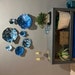 Bring color and movement your space with the radiant glow of This set of 9 blues with aqua, silver ,black and green wall flowers. The light filters through creating a colorful effect on the hanging surface.