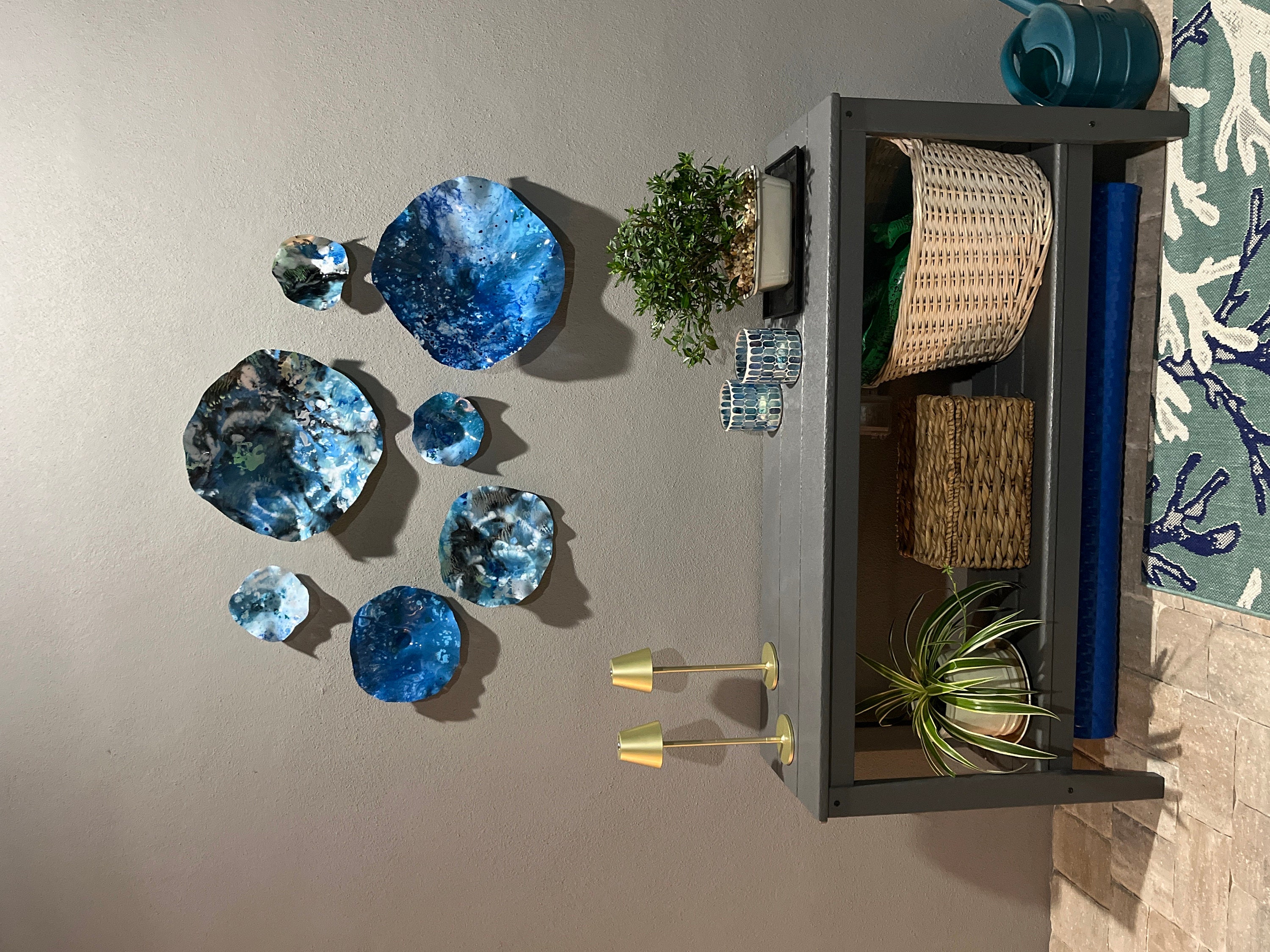 Wall flower sculpture 7 handmade beach home decor Blue/aqua/green/silver/black platter art/eco-friendly plastic looks like glass/ceiling art