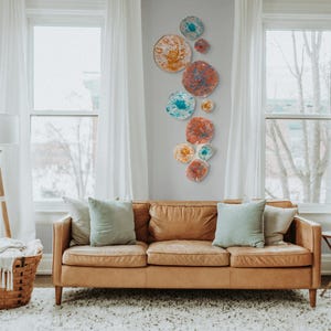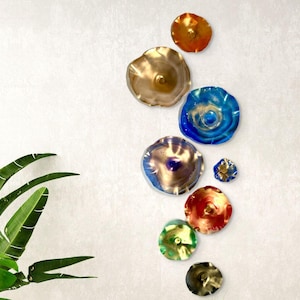 Handmade Vibrant metallic, colorful wall flowers set of 9. This piece will add color and joy to any space. The light filters through casting a colorful effect on the hanging surface. The flowers pictured are the ones you will receive.