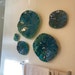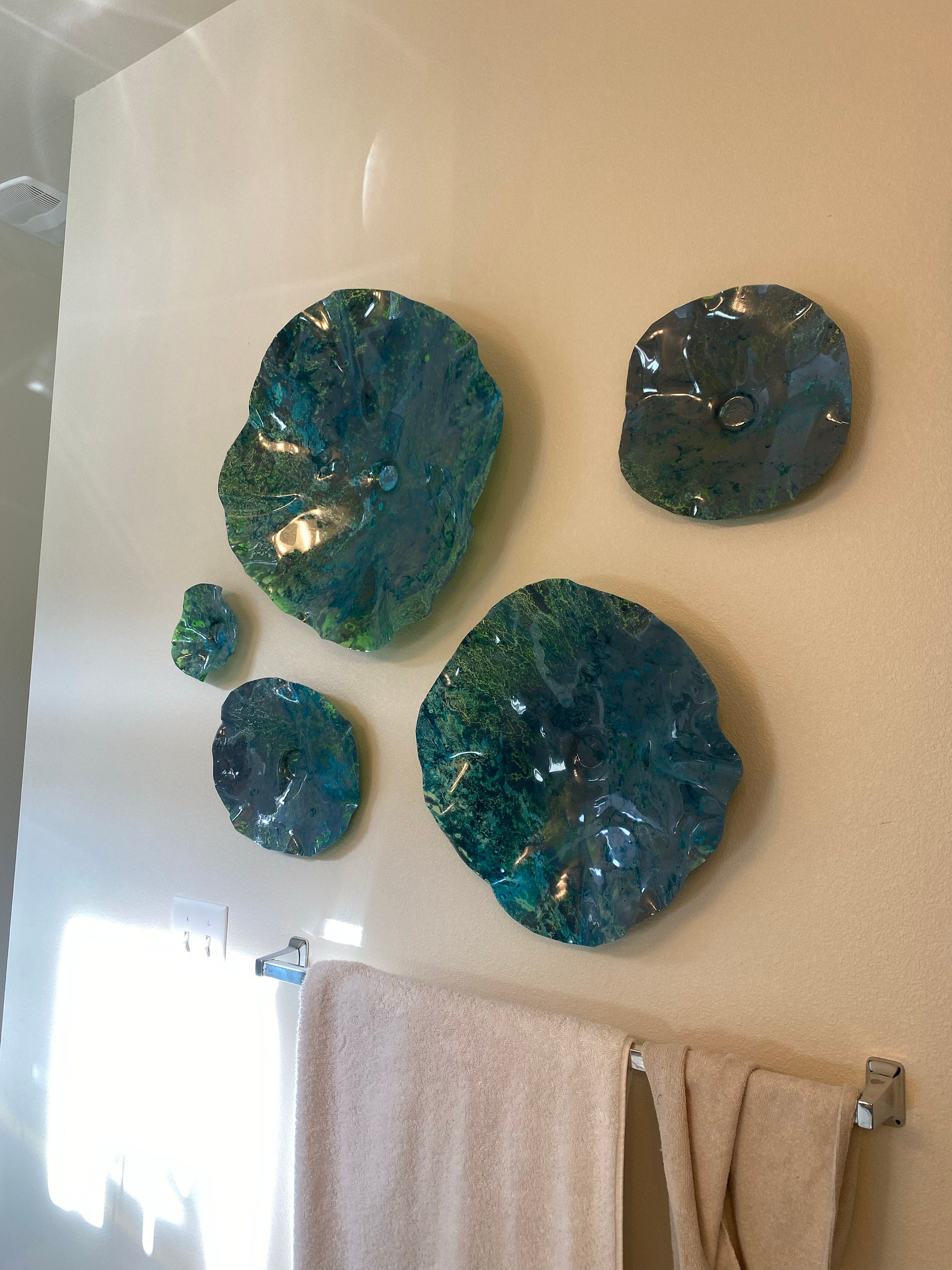 Metallic teal/green/lavender wall flower sculpture 5 handmade beach home decor platter art/eco-friendly plastic looks like glass/ceiling art