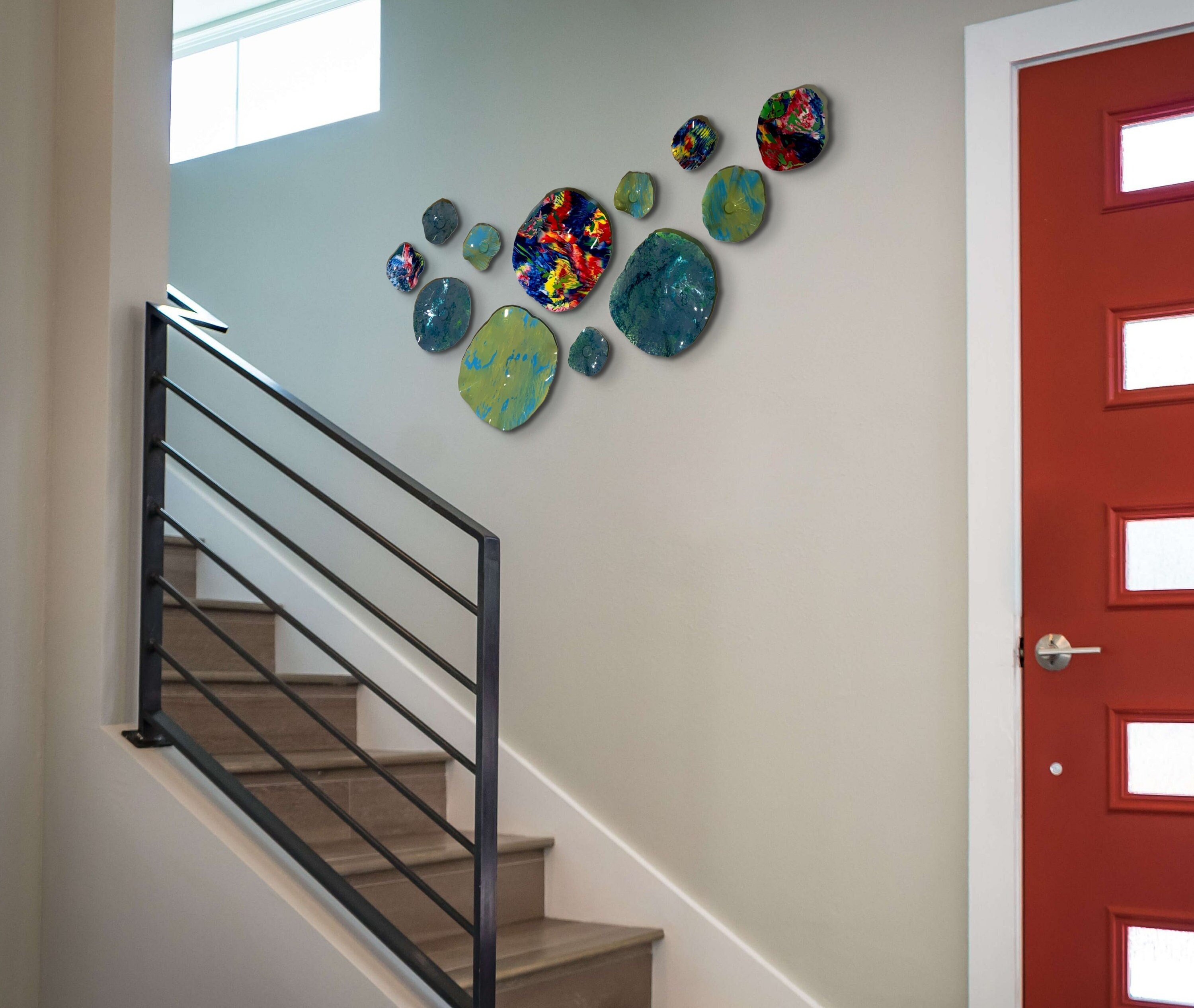 From the wall, they look like glass. The bonuses are that these flowers are light, unbreakable, environmentally friendly, easy to hang, and have no damage to the wall due to drilling for would-be-heavy traditional glass flowers.
