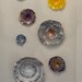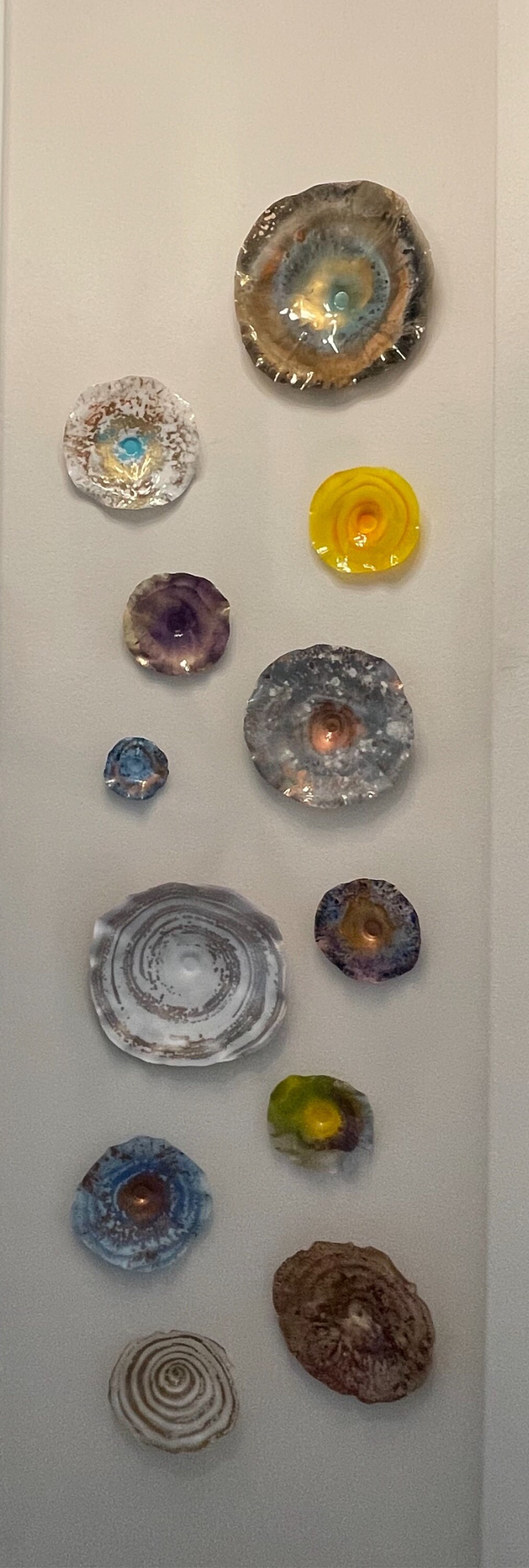 Wall flower sculpture set of 7 This spectacular uplifting set of neutral earth tones with a hint of metallic will brighten up any space. Brown with blues, copper, silver, gold aqua, white and gray . The light filters through creating a dramatic effect on the hanging surface.