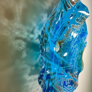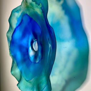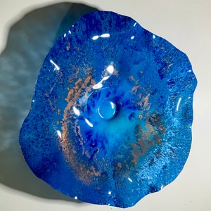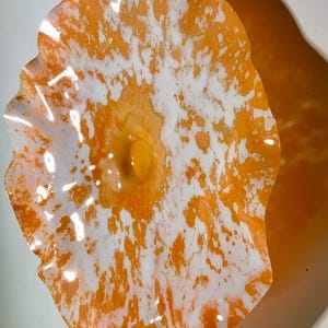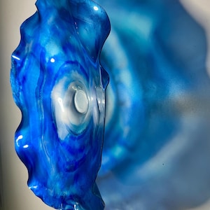 Each collectible piece is unique, no two are alike. This permanent, colorful, eye catching art looks and feels like glass. It shimmers in the light resembling water. They are very DURABLE AND LIGHTWEIGHT. This flower is easy to hang all weather and UV resistant. Great for indoor or outdoor decorating.