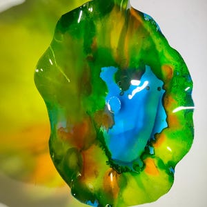 Each collectible piece is unique, no two are alike. This permanent, colorful, eye catching art looks like glass. It shimmers in the light resembling water. They are very DURABLE AND LIGHTWEIGHT. These flowers are easy to hang, are all weather and UV resistant. Great for indoor or outdoor decorating.