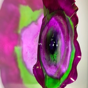 Each collectible piece is unique, no two are alike. This permanent, colorful, eye catching art looks like glass. It shimmers in the light resembling water. They are very DURABLE AND LIGHTWEIGHT. These flowers are easy to hang, all weather , and will not fade in the sun. Great for indoor or outdoor decorating.
