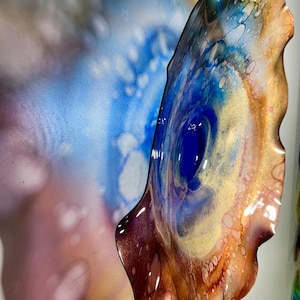 Each collectible piece is unique, no two are alike. This permanent, colorful, eye catching art looks and feels like glass. It shimmers in the light resembling water. They are very DURABLE, AND LIGHTWEIGHT. These flowers are easy to hang, all weather and UV resistant. Great for indoor or outdoor decorating.