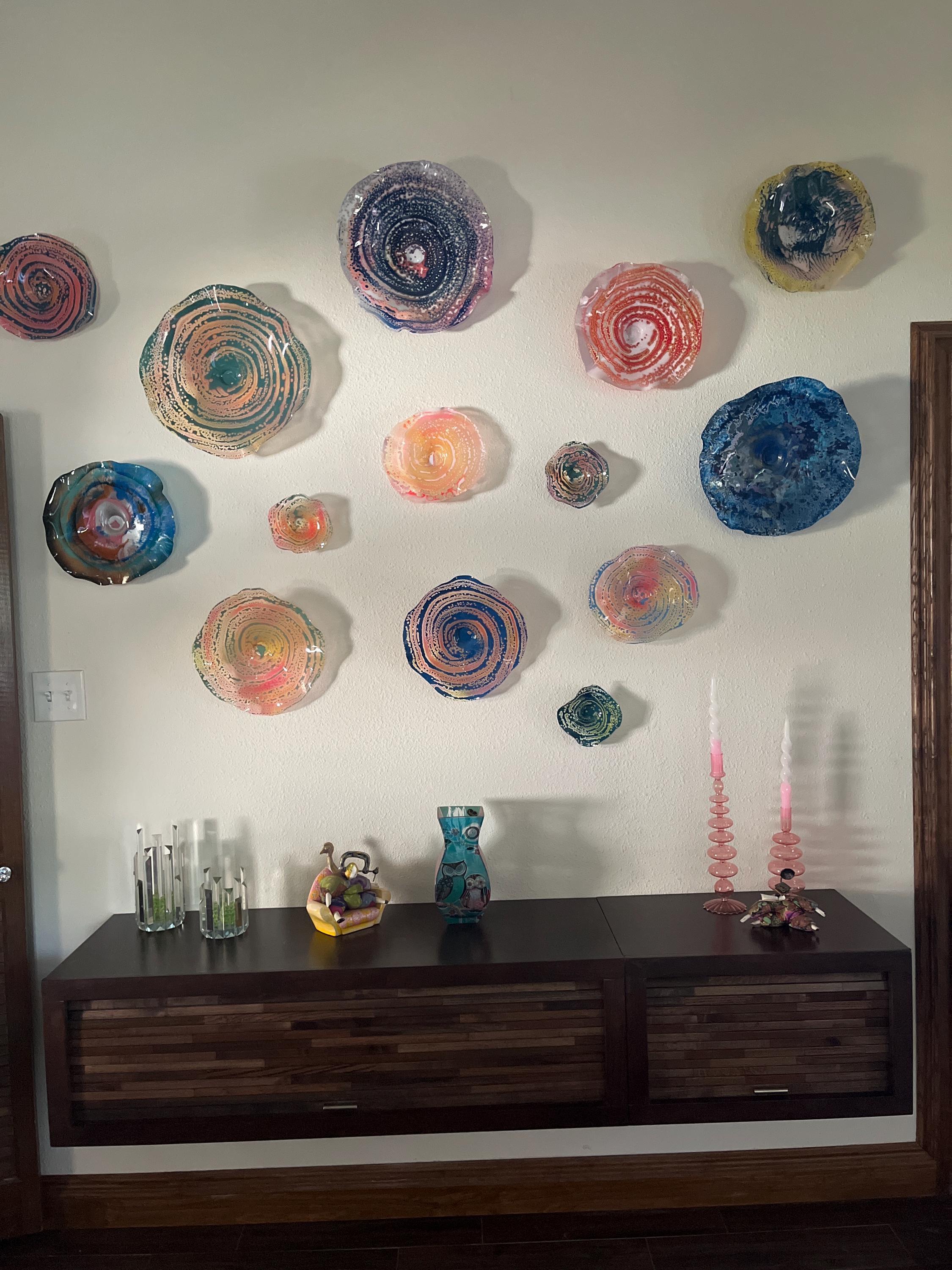 Each collectible piece is unique, no two are alike. This permanent, colorful, eye catching art looks and feels like glass. It shimmers in the light resembling water. They are very DURABLE, AND LIGHTWEIGHT. These flowers are easy to hang, all weather and UV resistant. Great for indoor or outdoor decorating.