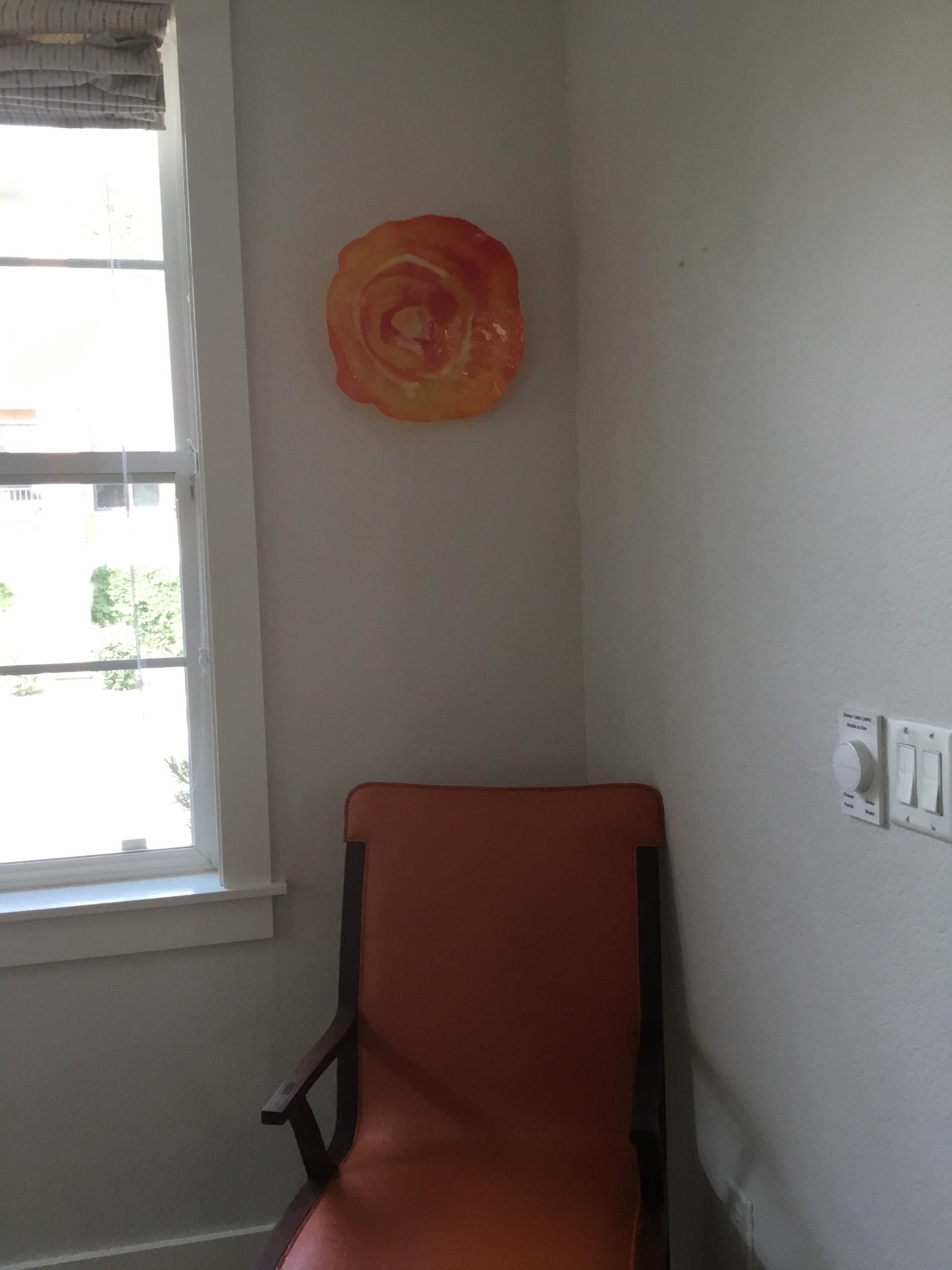 Modern wall flower sculpture large 15 to 16 inches . Stunning conversation piece eye catching burnt orange with yellow blend. The light filters through creating a colorful effect on the hanging surface.