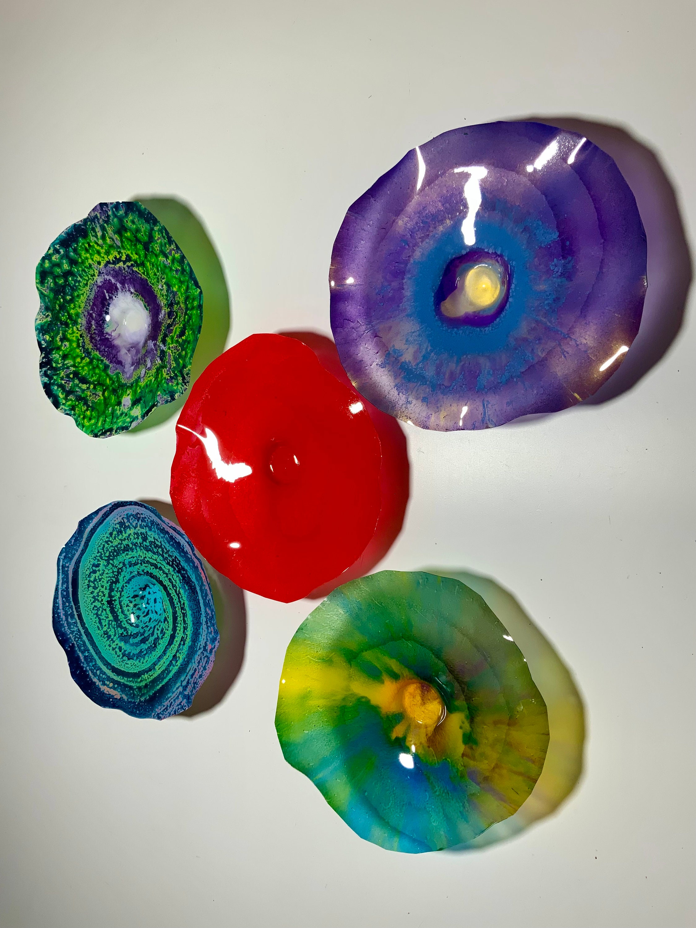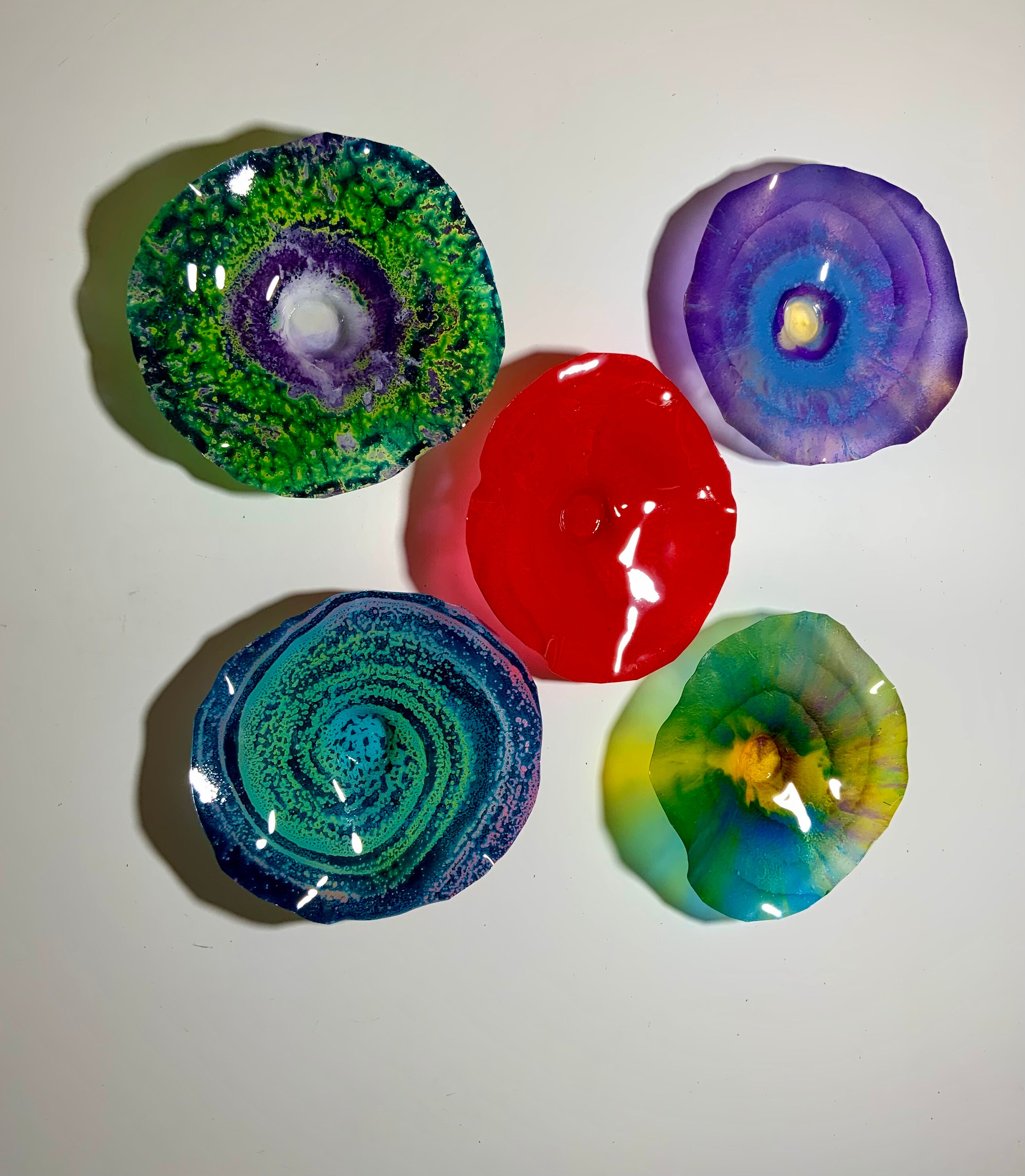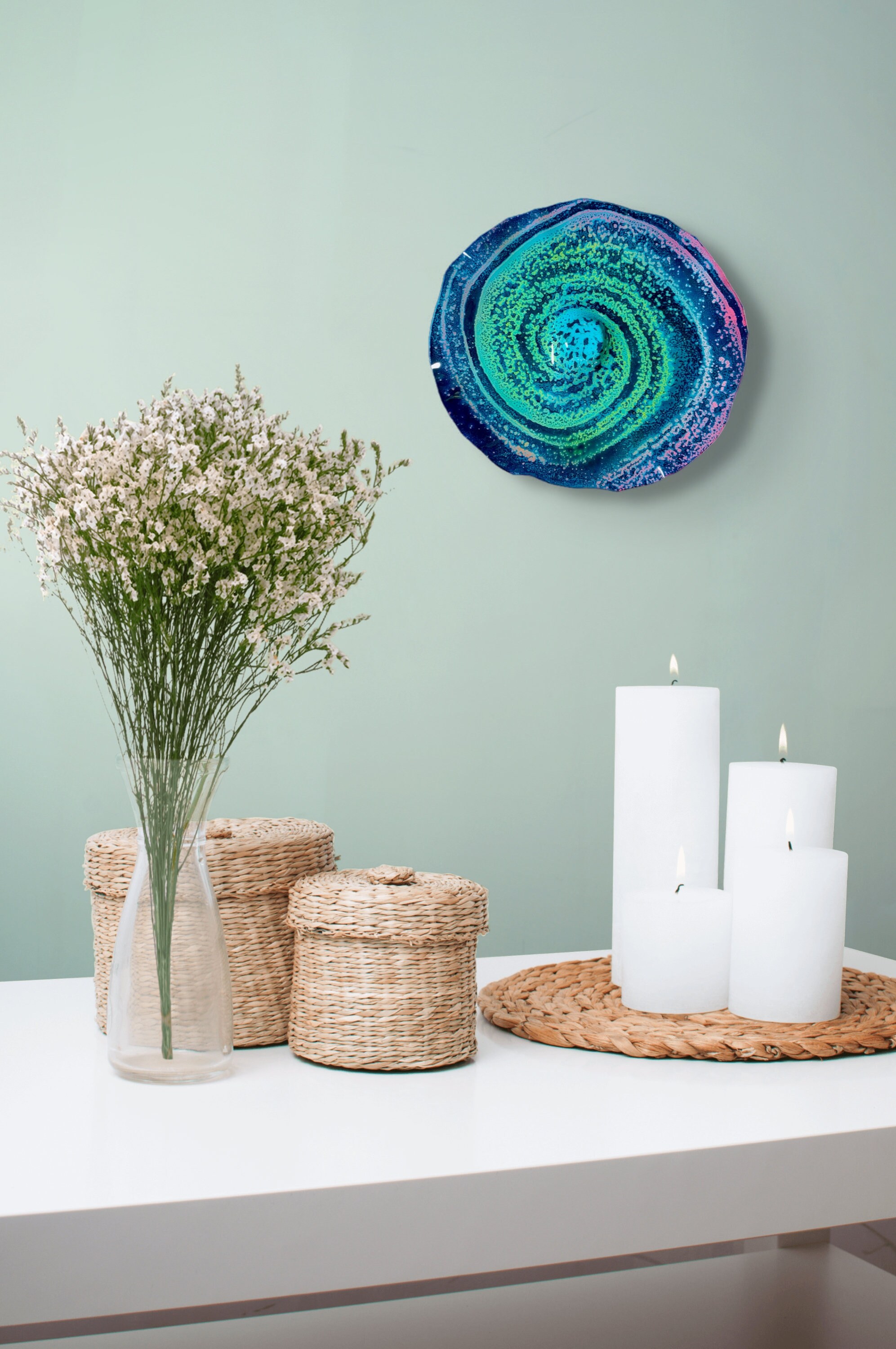 Small round wall flower 9” handmade eco friendly plastic Todd Lynd art/blue/mint green/aqua/pink kitchen decor/looks like glass/cool art