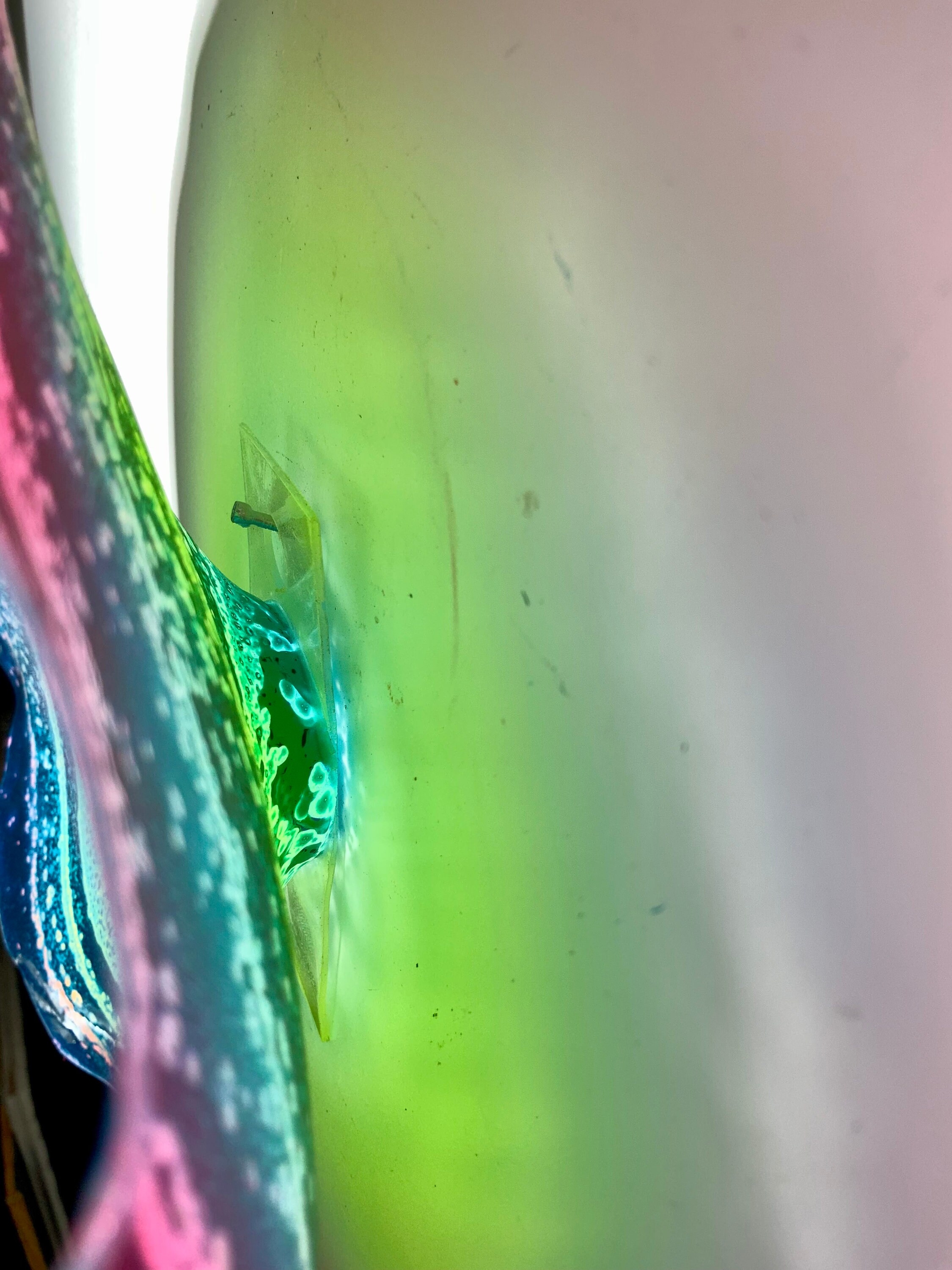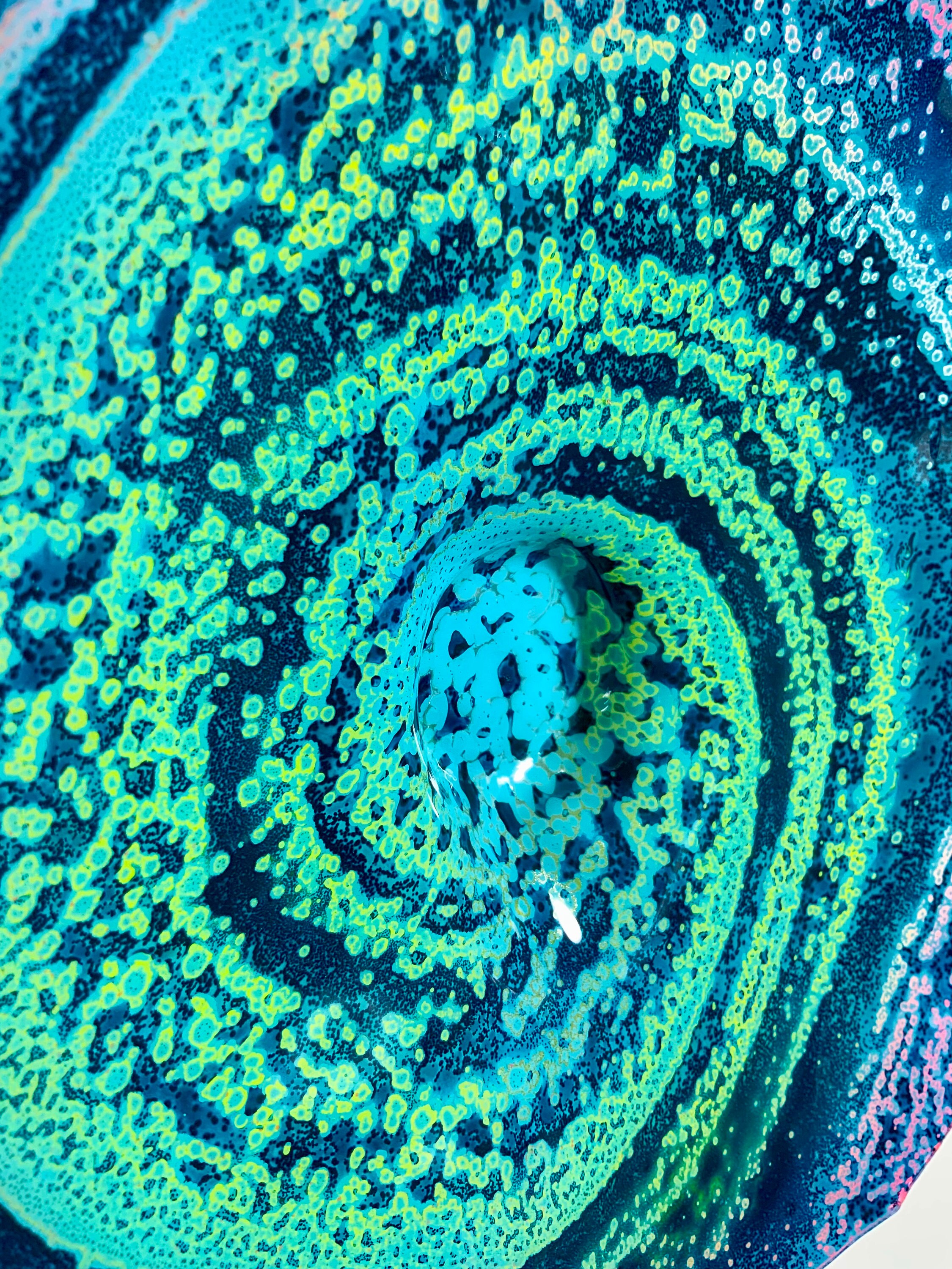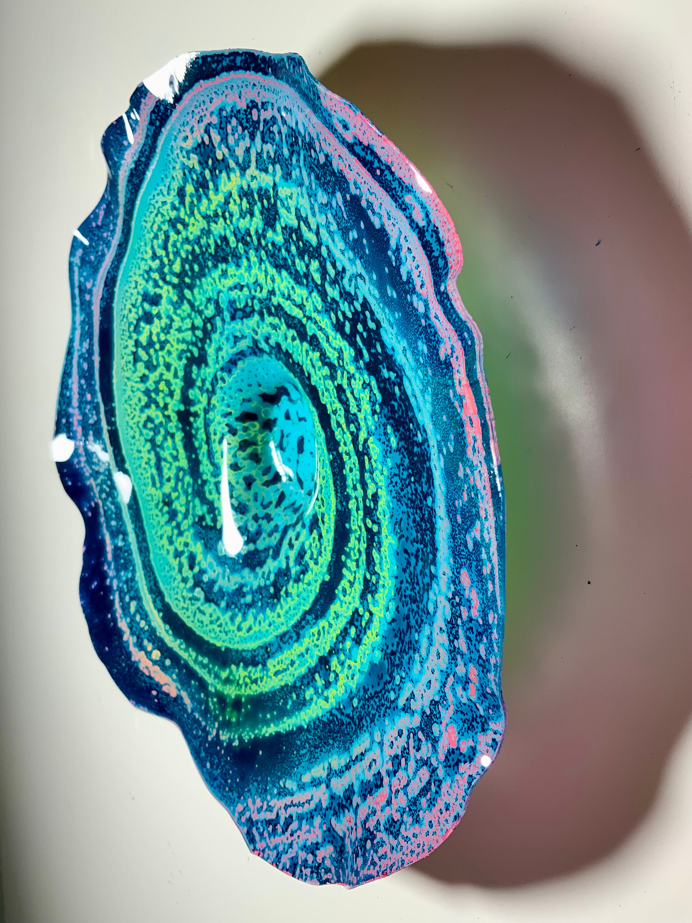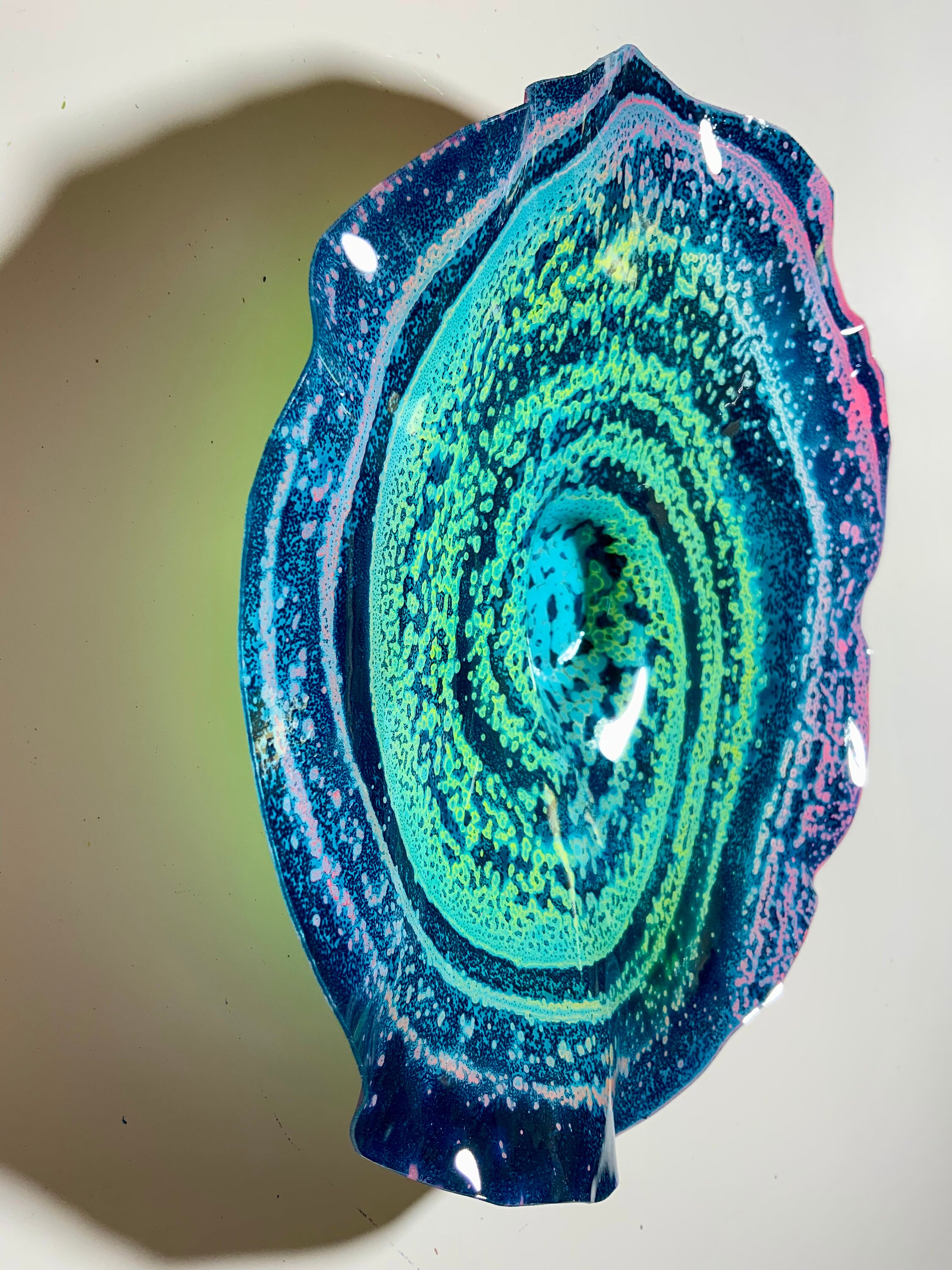 Small round wall flower 9” handmade eco friendly plastic Todd Lynd art/blue/mint green/aqua/pink kitchen decor/looks like glass/cool art