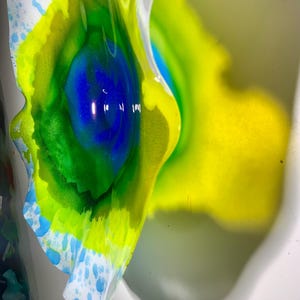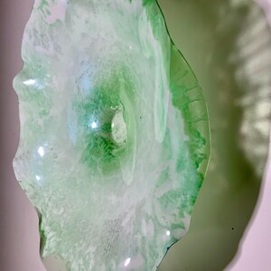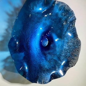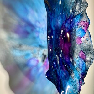 Each collectible piece is unique, no two are alike. This permanent, colorful, eye catching art looks and feels like glass. It shimmers in the light resembling water. They are very DURABLE, AND LIGHTWEIGHT. These flowers are easy to hang, all weather and UV resistant. Great for indoor or outdoor decorating.