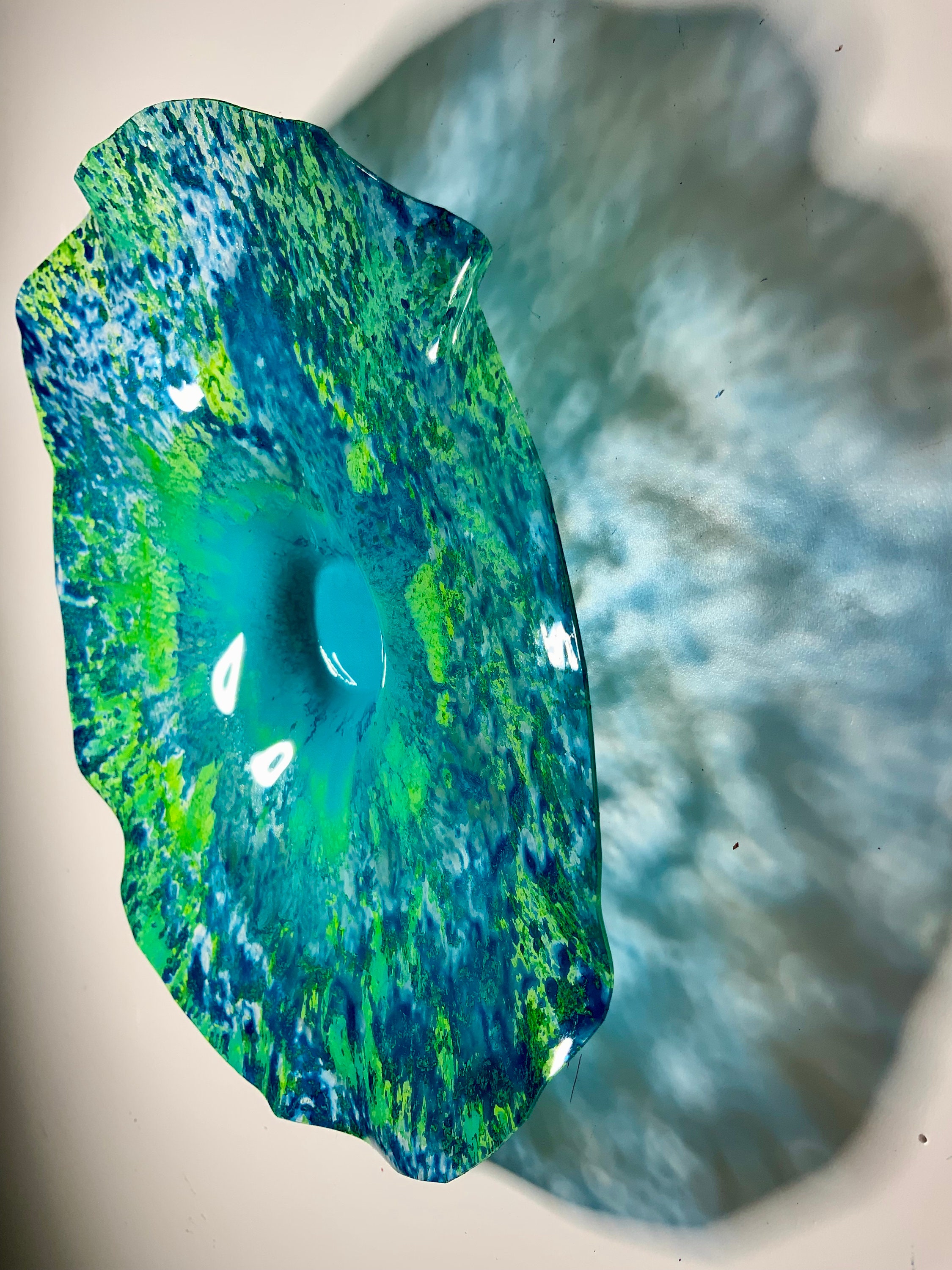 From the wall, they look like glass. The bonuses are that these flowers are light, unbreakable, environmentally friendly, easy to hang, and have no damage to the wall due to drilling for would-be-heavy traditional glass flowers.