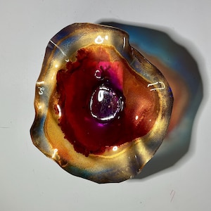 Each collectible piece is unique, no two are alike. This permanent, colorful, eye catching art looks and feels like glass. It shimmers in the light resembling water. They are very DURABLE AND LIGHTWEIGHT. These flowers are easy to hang, are all weather and UV resistant. Great for indoor or outdoor decorating.