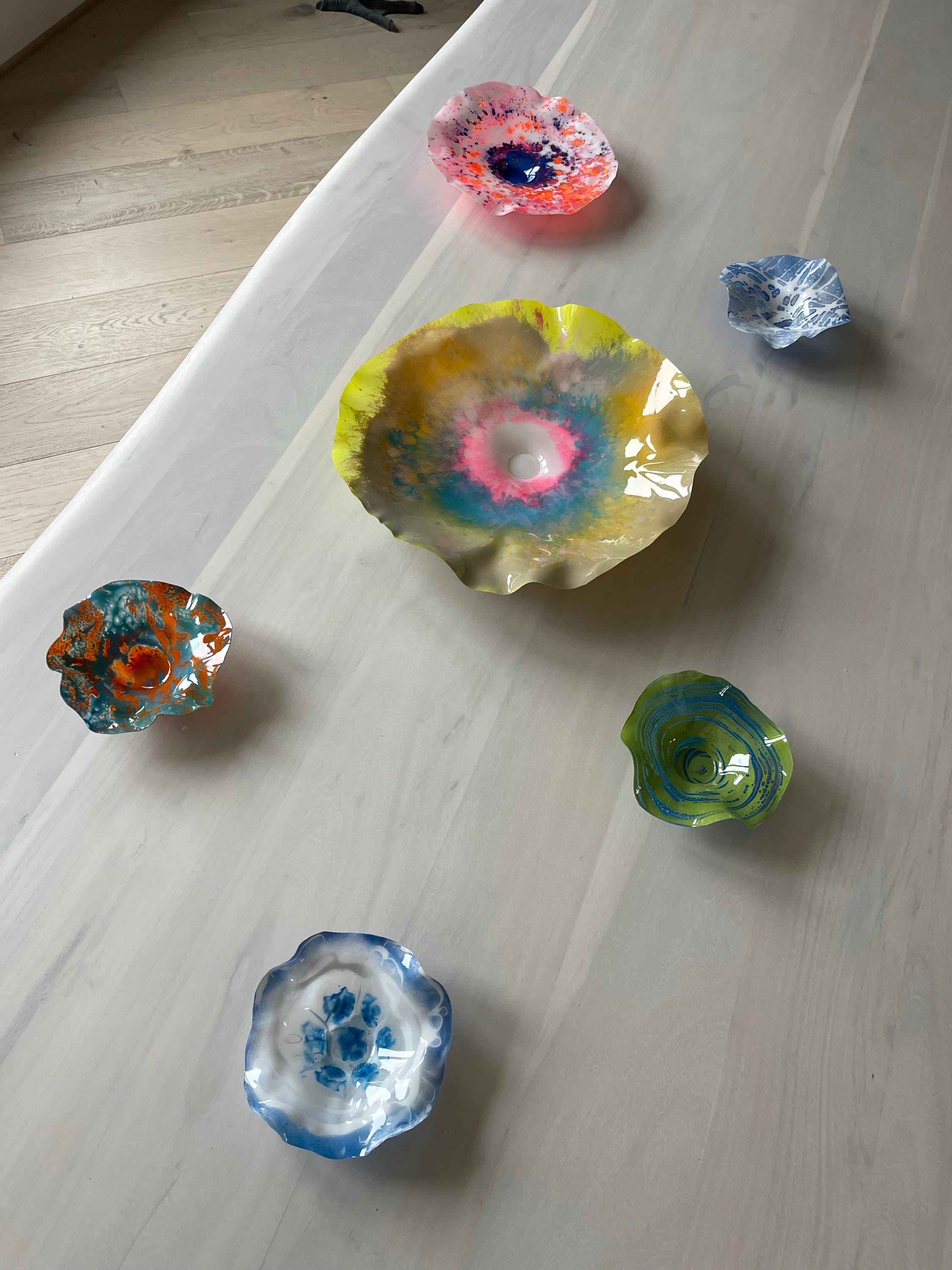 Each collectible piece is unique, no two are alike. This permanent, colorful, eye catching art looks and feels like glass. It shimmers in the light resembling water. They are very DURABLE AND LIGHTWEIGHT. These flowers are easy to hang, are all weather and UV resistant. Great for indoor or outdoor decorating.