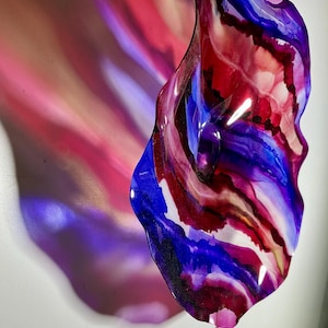 Each collectible piece is unique, no two are alike. This permanent, colorful, eye catching art looks and feels like glass. It shimmers in the light resembling water. They are very DURABLE AND LIGHTWEIGHT. This flower is easy to hang all weather and UV resistant. Great for indoor or outdoor decorating.