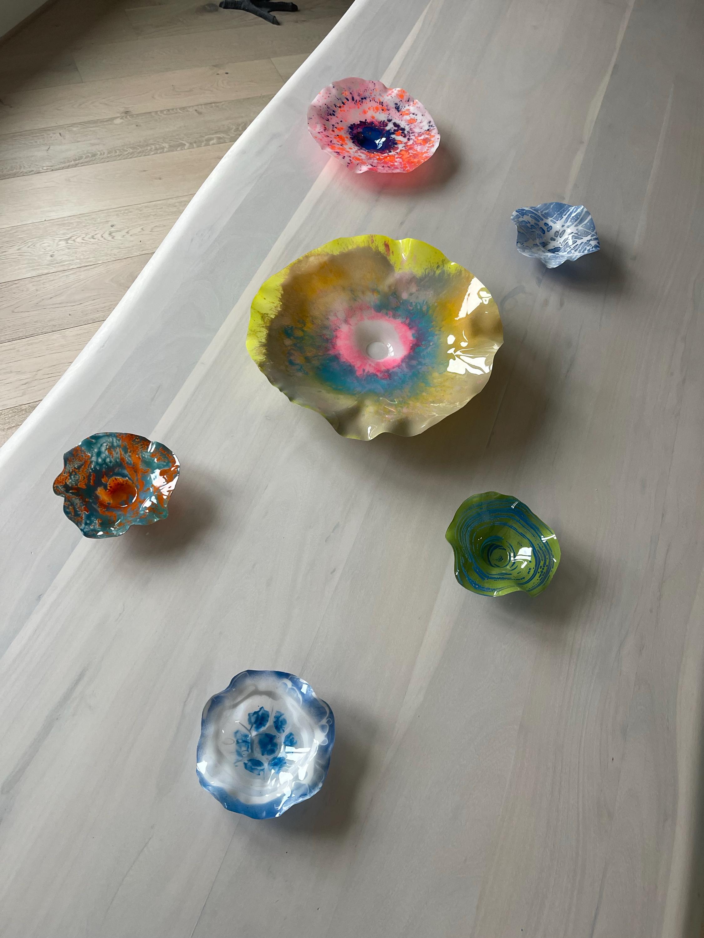 Each collectible piece is unique, no two are alike. This permanent, colorful, eye catching art looks and feels like glass. It shimmers in the light resembling water. They are very DURABLE AND LIGHTWEIGHT. These flowers are easy to hang, are all weather and UV resistant. Great for indoor or outdoor decorating.