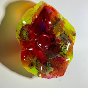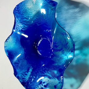 Each collectible piece is unique, no two are alike. This permanent, colorful, eye catching art looks and feels like glass. It shimmers in the light resembling water. They are very DURABLE AND LIGHTWEIGHT. These flowers are easy to hang, are all weather and UV resistant. Great for indoor or outdoor decorating.