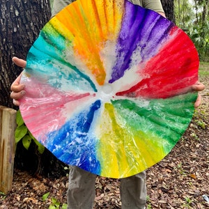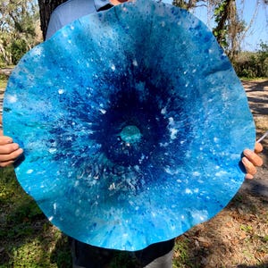 New extra extra Large wall flower! Beautiful, colorful blues with yellow, red, orange,and pink with a hint of metallic . This magnificent piece will add light and joy to any space. The light passes thru casting colorful effects on the hanging surface.