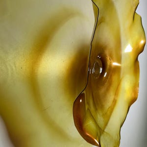 Each collectible piece is unique, no two are alike. This permanent, colorful, eye catching art looks and feels like glass. It shimmers in the light resembling water. They are very DURABLE, AND LIGHTWEIGHT. These flowers are easy to hang, all weather and UV resistant Great for indoor or outdoor decorating.