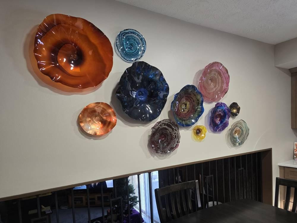 Each collectible piece is unique, no two are alike. This permanent, colorful, eye catching art looks like glass. It shimmers in the light resembling water. They are very DURABLE AND LIGHTWEIGHT. These flowers are easy to hang, all weather , and UV resistant. Great for indoor or outdoor decorating.