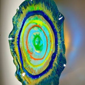 .Each collectible piece is unique, no two are alike. This permanent, colorful, eye catching art looks like glass. It shimmers in the light resembling water. They are very DURABLE AND LIGHTWEIGHT. Great for indoor or outdoor decorating.
