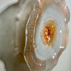Each collectible piece is unique, no two are alike. This permanent, colorful, eye catching art looks and feels like glass. It shimmers in the light resembling water. They are very DURABLE AND LIGHTWEIGHT. This flower is easy to hang all weather and UV resistsnt. Great for indoor or outdoor decorating.