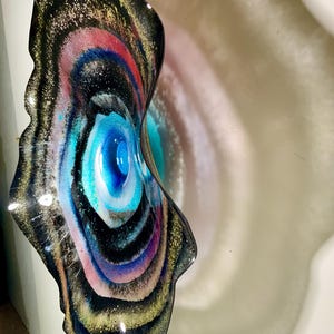 Each collectible piece is unique, no two are alike. This permanent, colorful, eye catching art looks like glass. It shimmers in the light resembling water. They are very DURABLE AND LIGHTWEIGHT. These flowers are easy to hang, all weather and UV resistant. Great for indoor or outdoor decorating.