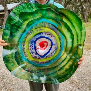 Each collectible piece is unique, no two are alike. This permanent, colorful, eye catching art looks like glass. It shimmers in the light resembling water. They are very DURABLE AND LIGHTWEIGHT. These flowers are easy to hang, are all weather and UV resistant. Great for indoor or outdoor decorating.