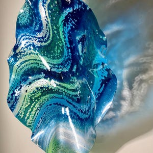 Each collectible piece is unique, no two are alike. This permanent, colorful, eye catching art looks like glass. It shimmers in the light resembling water. They are very DURABLE AND LIGHTWEIGHT. These flowers are easy to hang, are all weather and will not fade in the sun. Great for indoor or outdoor decorating.