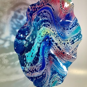Colorful Wall flower home decor blue with silver, turquoise, purple and coral blend. This fluid arrangement will bring any space to life. 15 to 16 inches . The light filters through creating a colorful effect on the hanging surface.