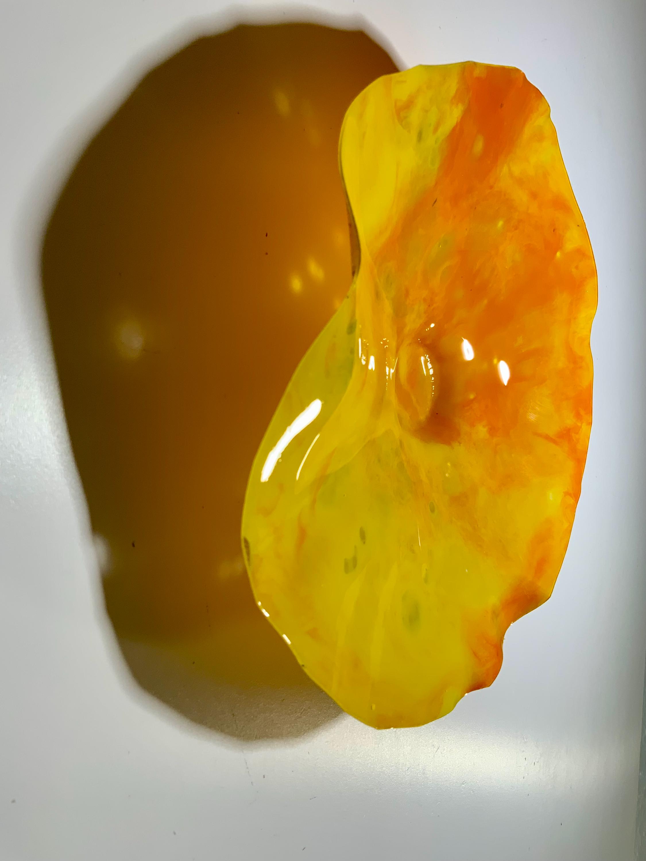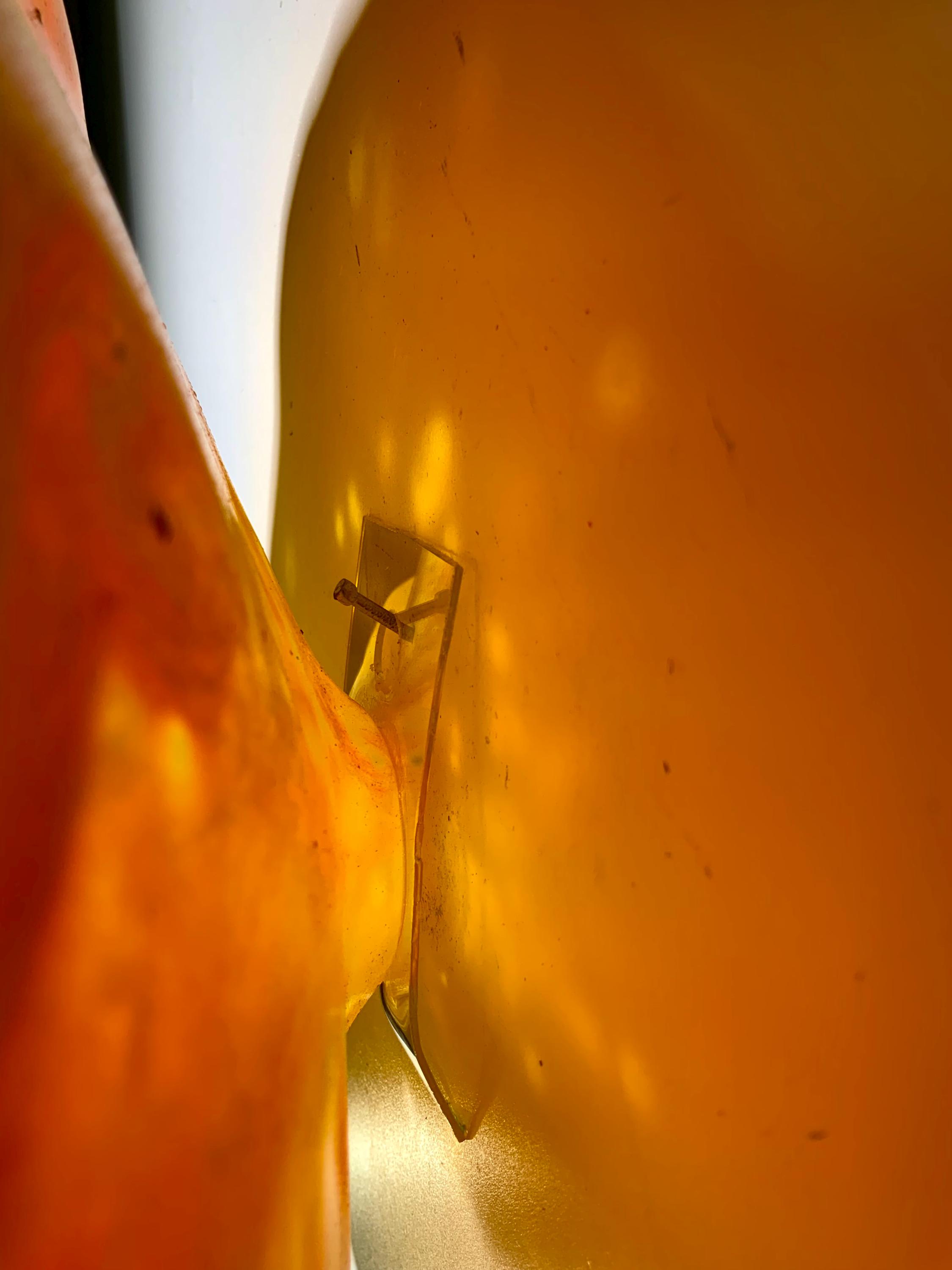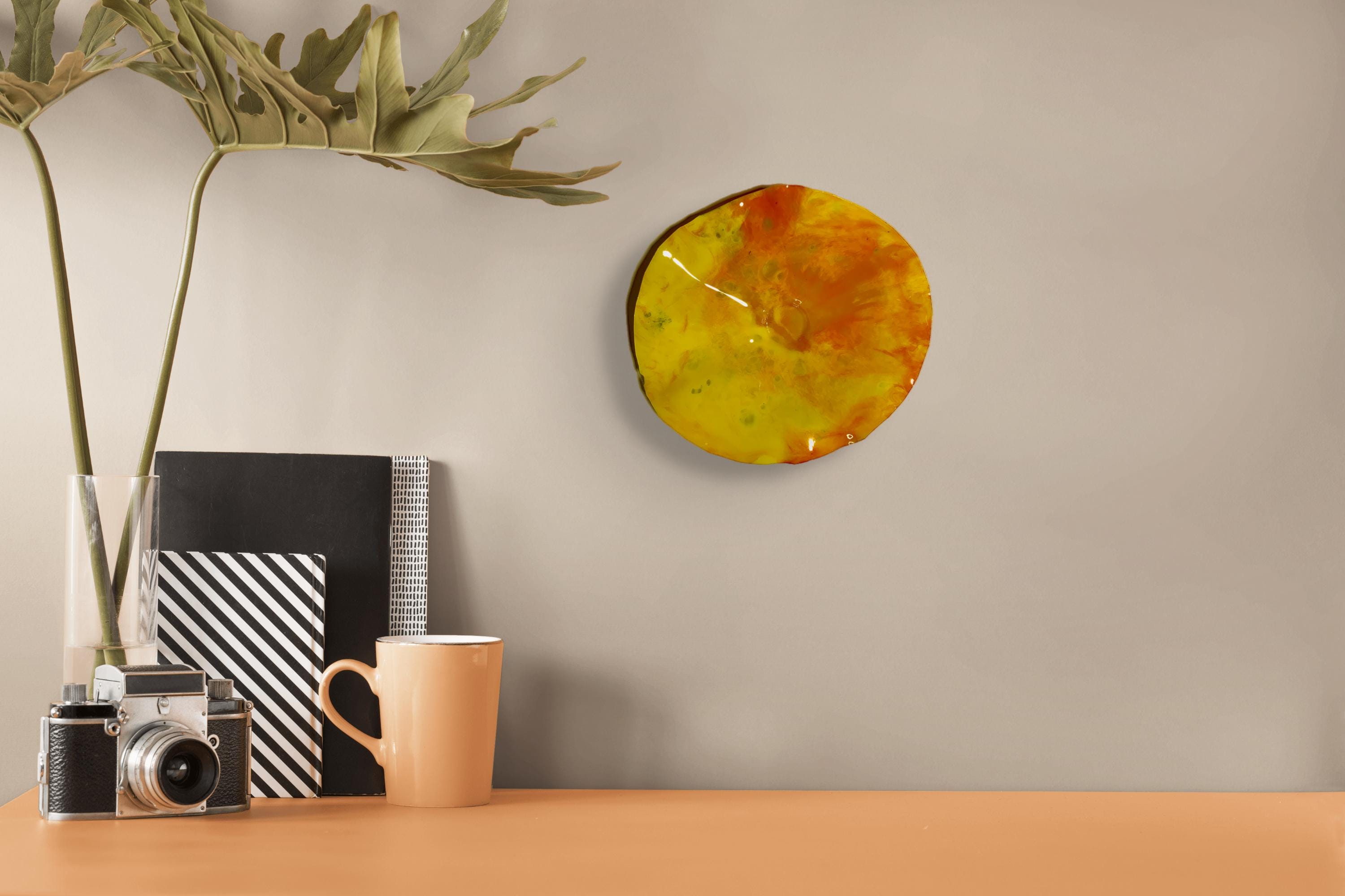 Eye catching wall flower brilliant colors of the sun orange and yellow. The light filters through casting a colorful glow to the hanging surface.