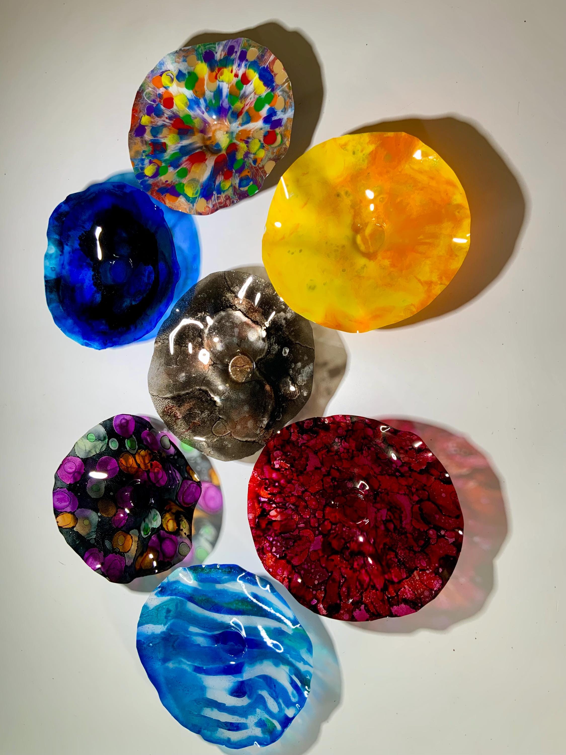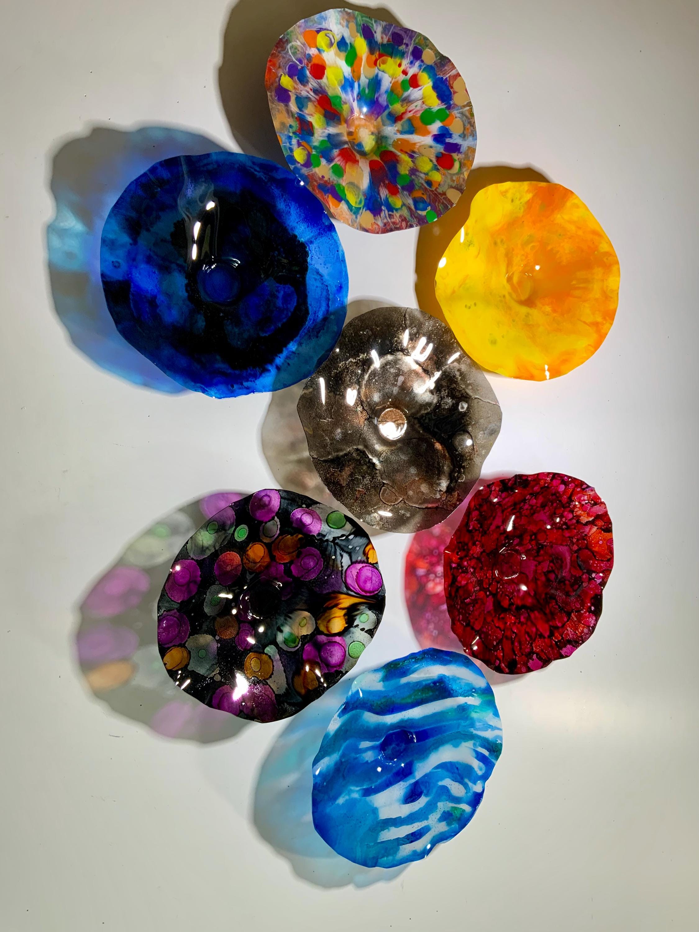 Each collectible piece is unique, no two are alike. This permanent, colorful, eye catching art looks and feels like glass. It shimmers in the light resembling water. They are very DURABLE AND LIGHTWEIGHT. These flowers are easy to hang, are all weather and UV resistant. Great for indoor or outdoor decorating.