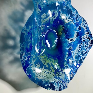 Each collectible piece is unique, no two are alike. This permanent, colorful, eye catching art looks and feels like glass. It shimmers in the light resembling water. They are very DURABLE AND LIGHTWEIGHT. These flowers are easy to hang, are all weather and UV resistant. Great for indoor or outdoor decorating.