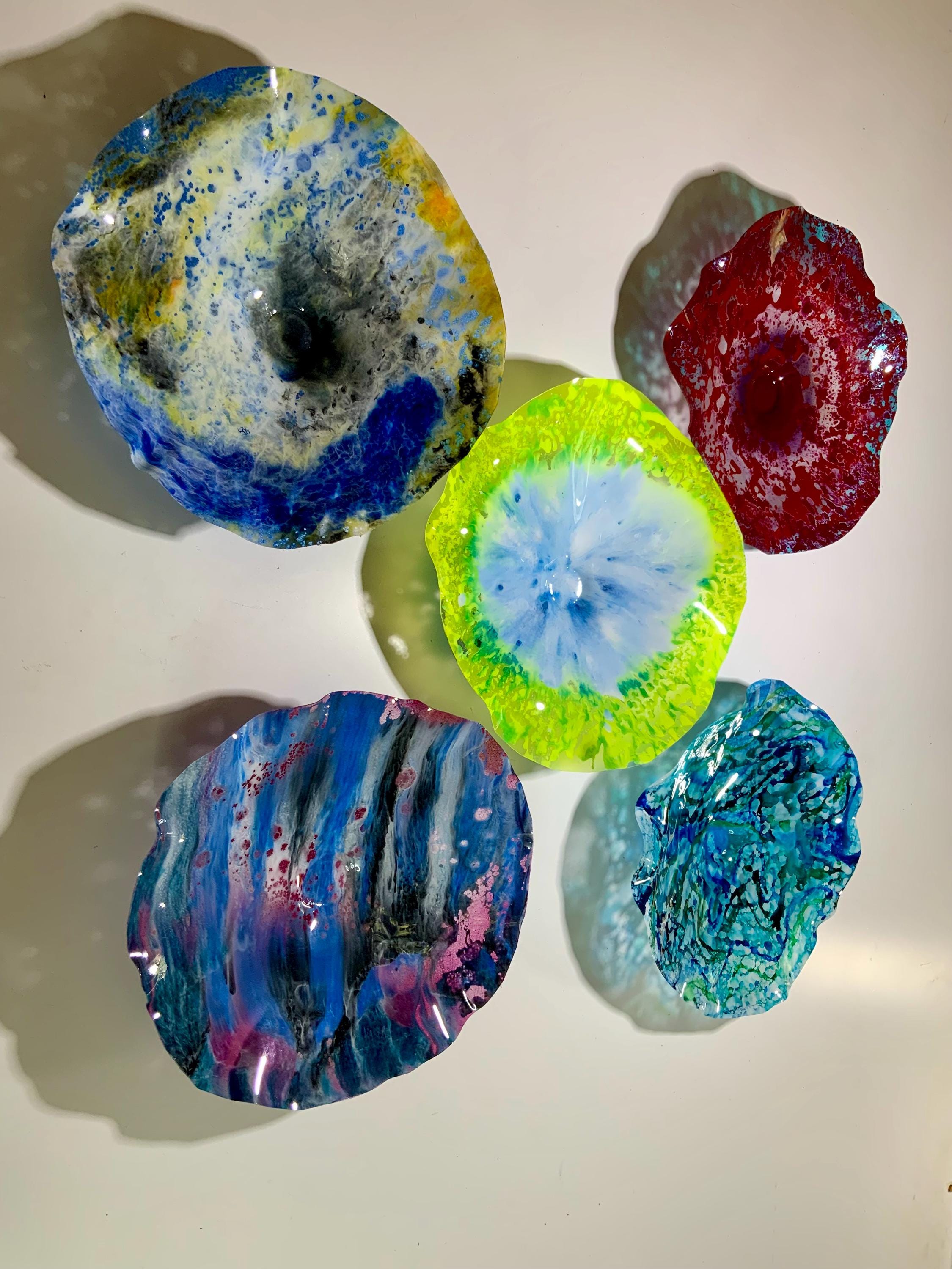 Each flower come with a hanger with a hole in the back for easy hanging. Each piece is light weight and all you will need is a nail or thumb tack to hang it from. If you can hang a picture, you can hang these plates. Each order comes with a set of hanging instructions. For outdoor hanging, please request our free outdoor hardware. For ceiling hanging please request velcro.