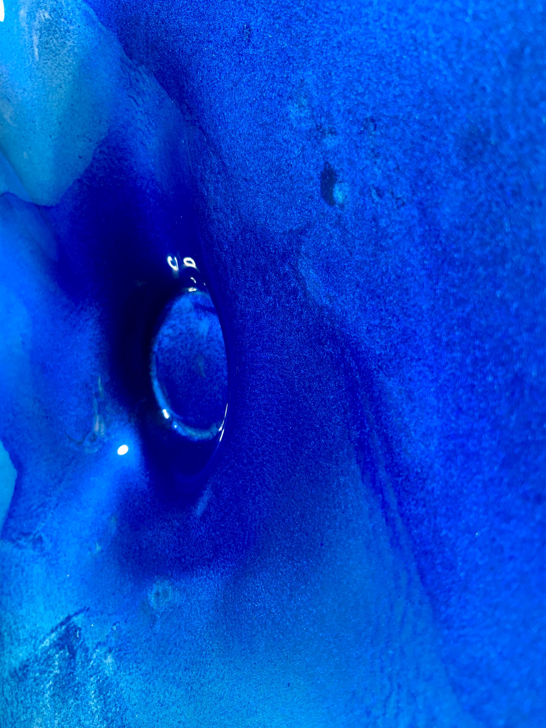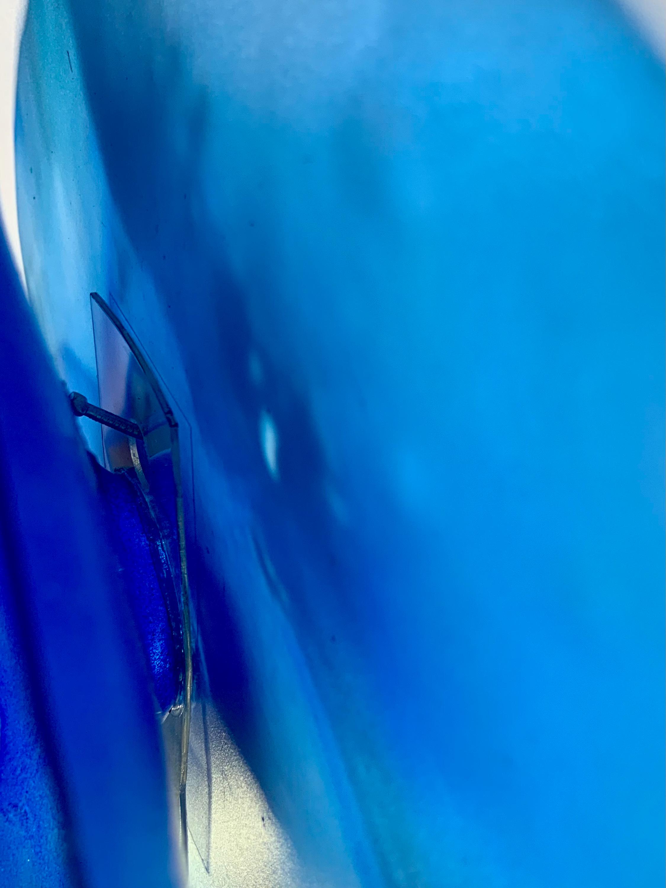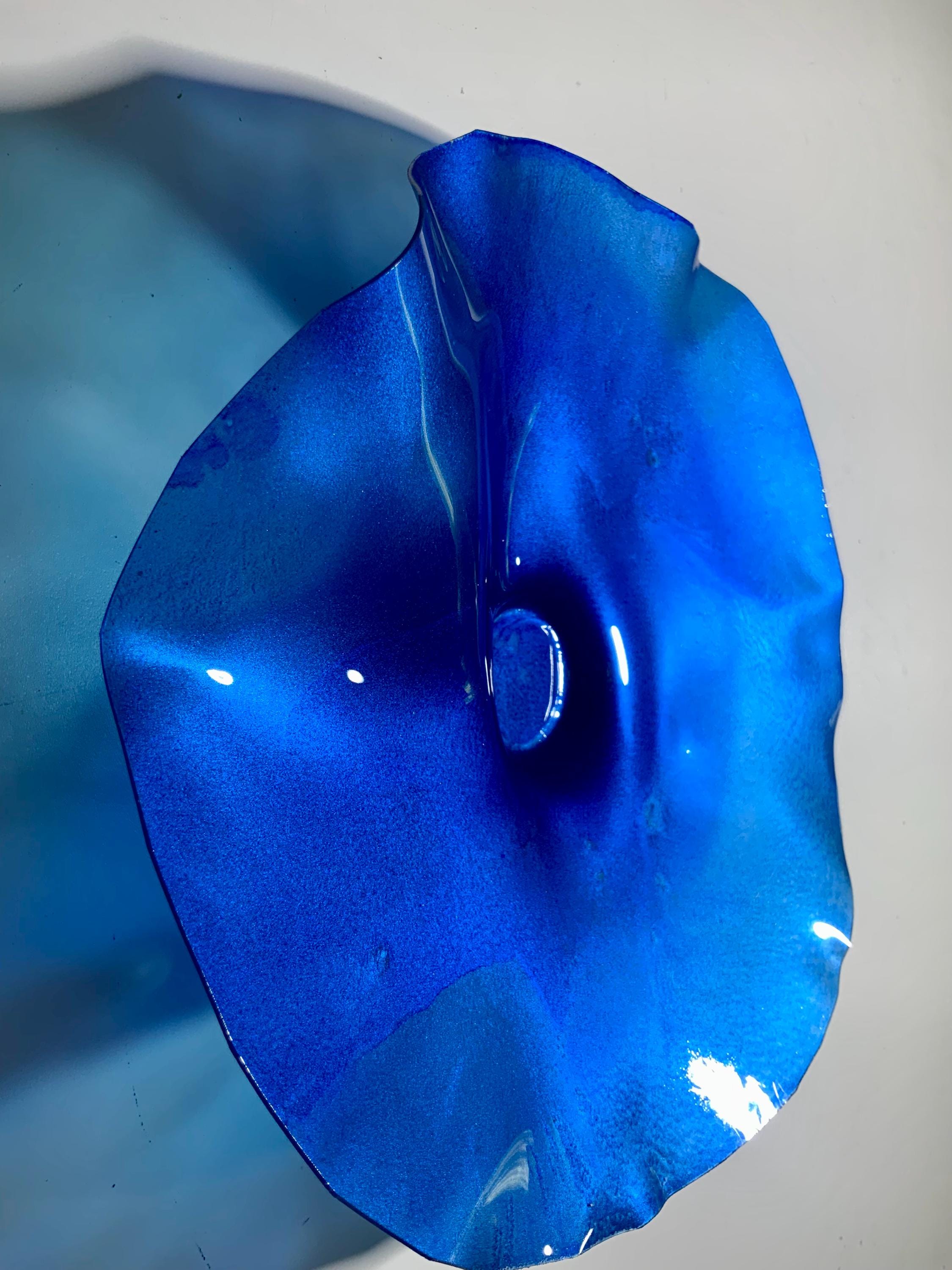 Radiant wall flower vibrant translucent blue. The light filters through casting a colorful glow to the hanging surface.