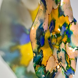 Each collectible piece is unique, no two are alike. This permanent, colorful, eye catching art looks and feels like glass. It shimmers in the light resembling water. They are very DURABLE AND LIGHTWEIGHT. These flowers are easy to hang, are all weather and UV resistant. Great for indoor or outdoor decorating.